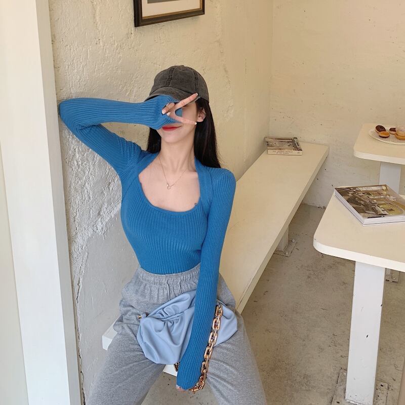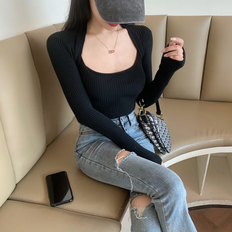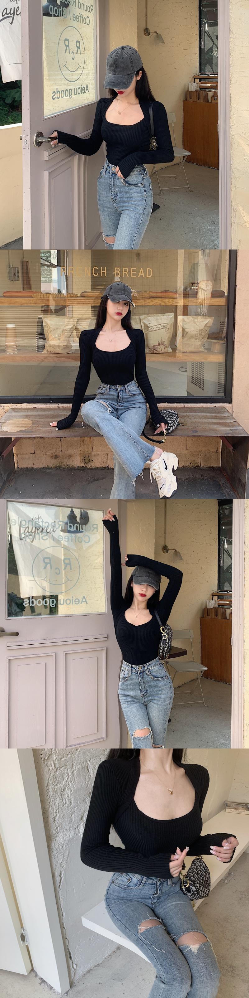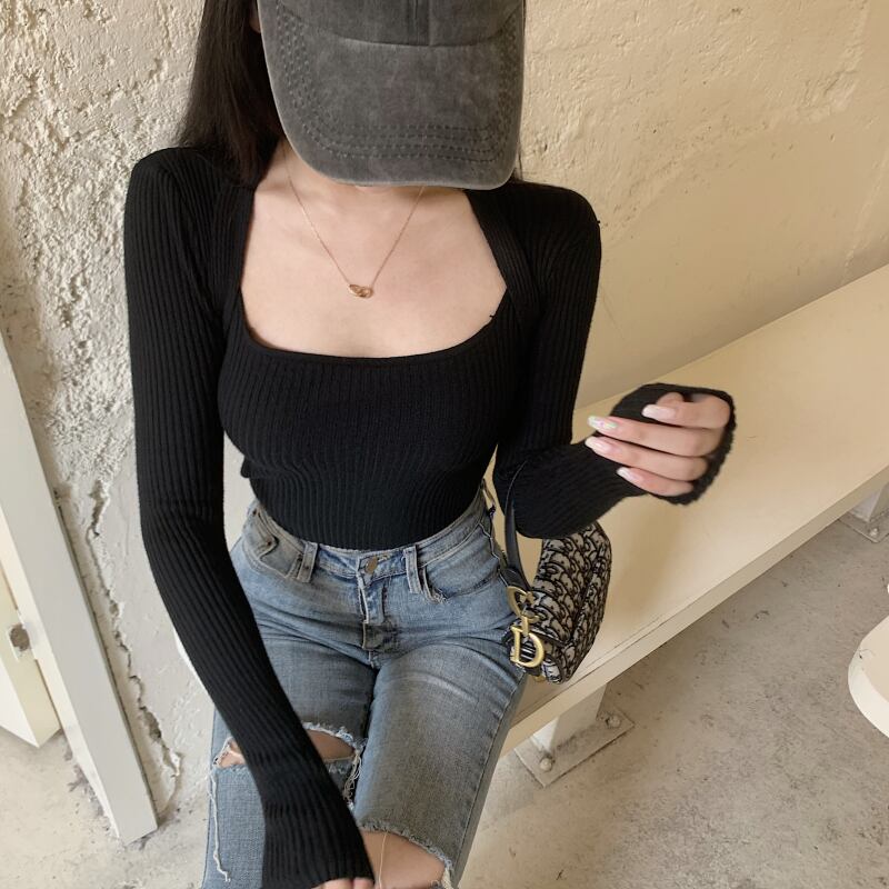 オータムブラックシャツ セーター スリムニットトップス ロング 秋物 ドラファッションホール90747665332