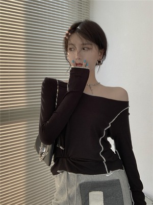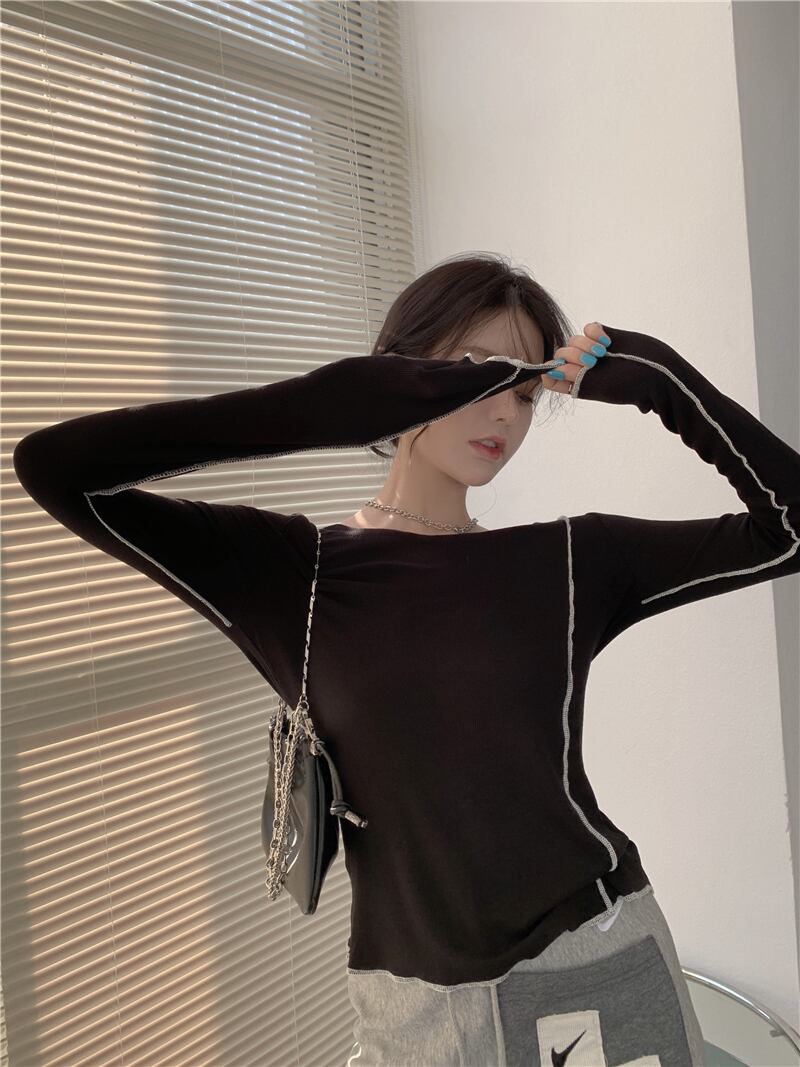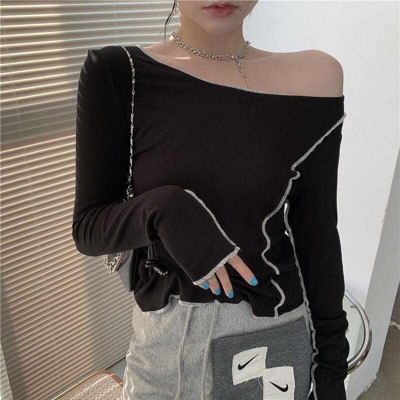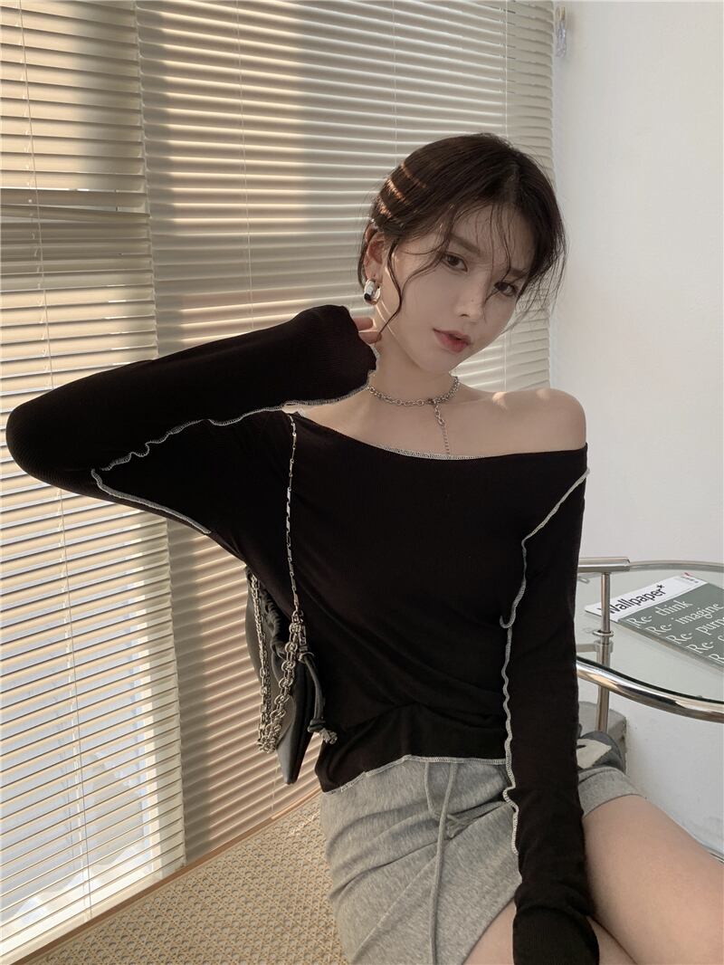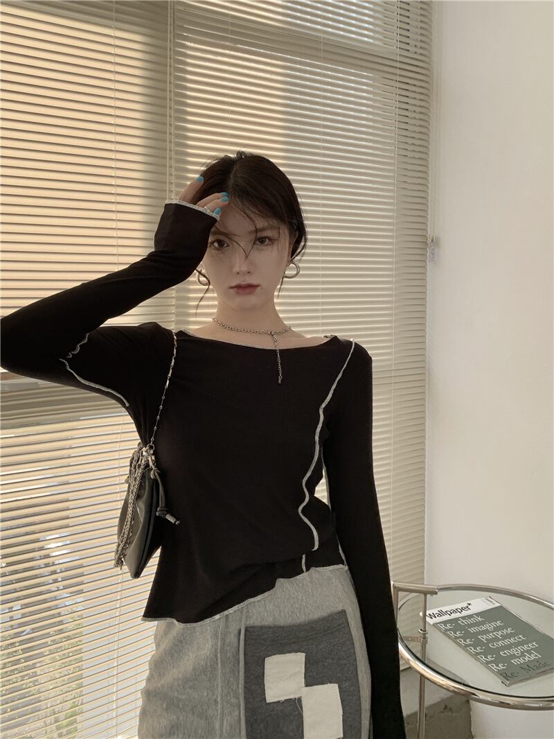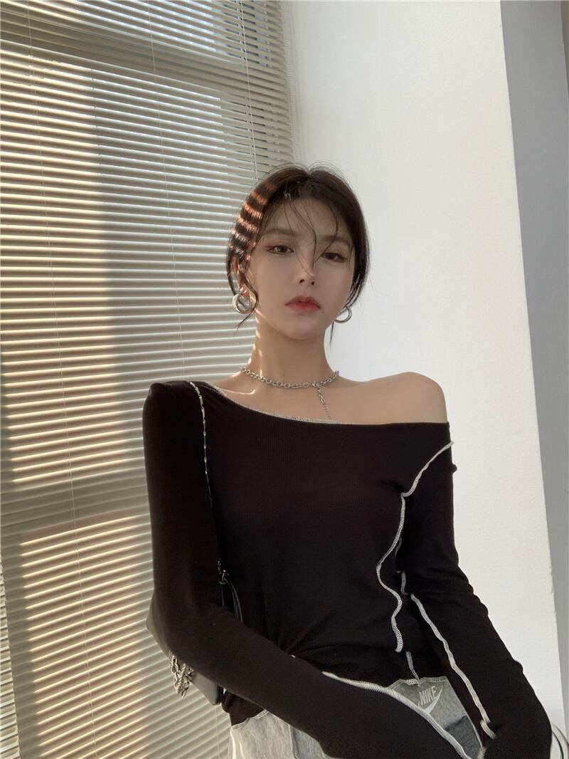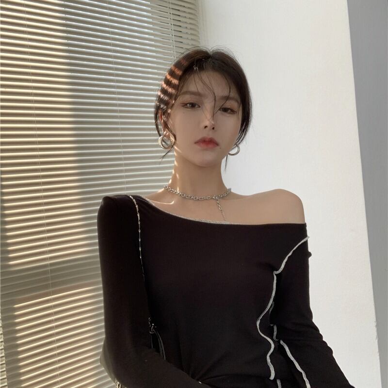 ブラックニットシャツ オータムTシャツ ストラップレススリムトップス ロング 秋物 ドラファッションホール50074920700
