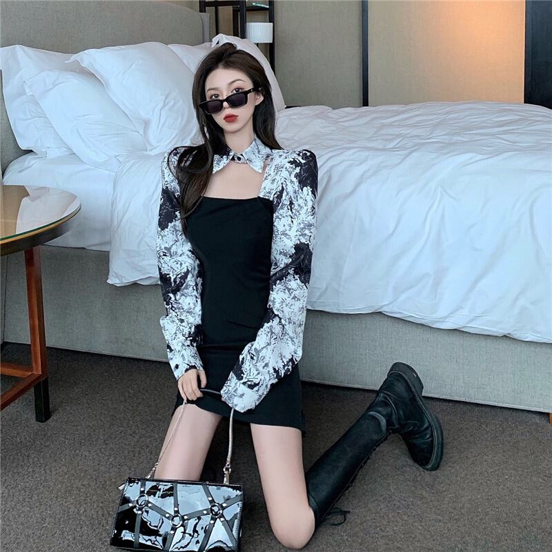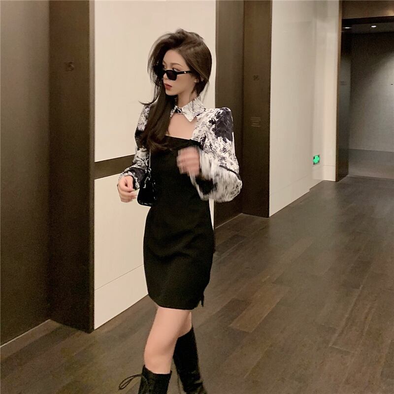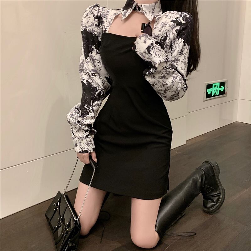 偽の2枚のインクジャカードスモールウエストウエスト気質ドレス女性2020年秋新しいセクシーバッグヒップスカート ドラファッションホール21592629621