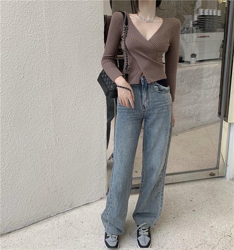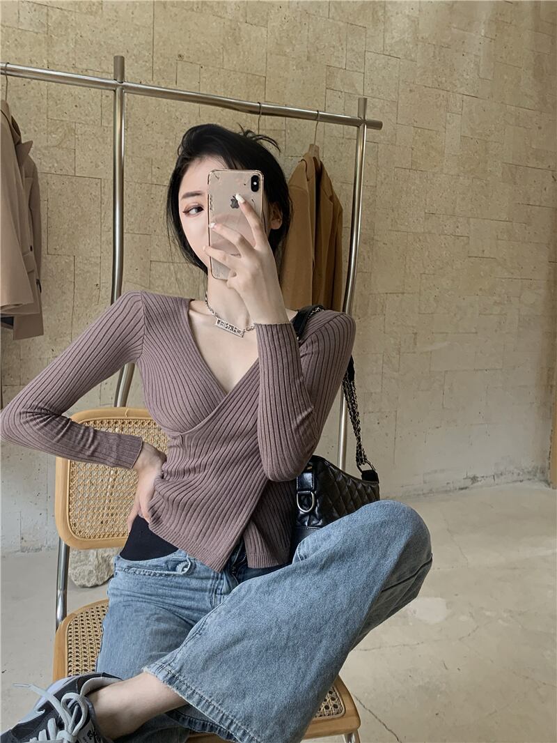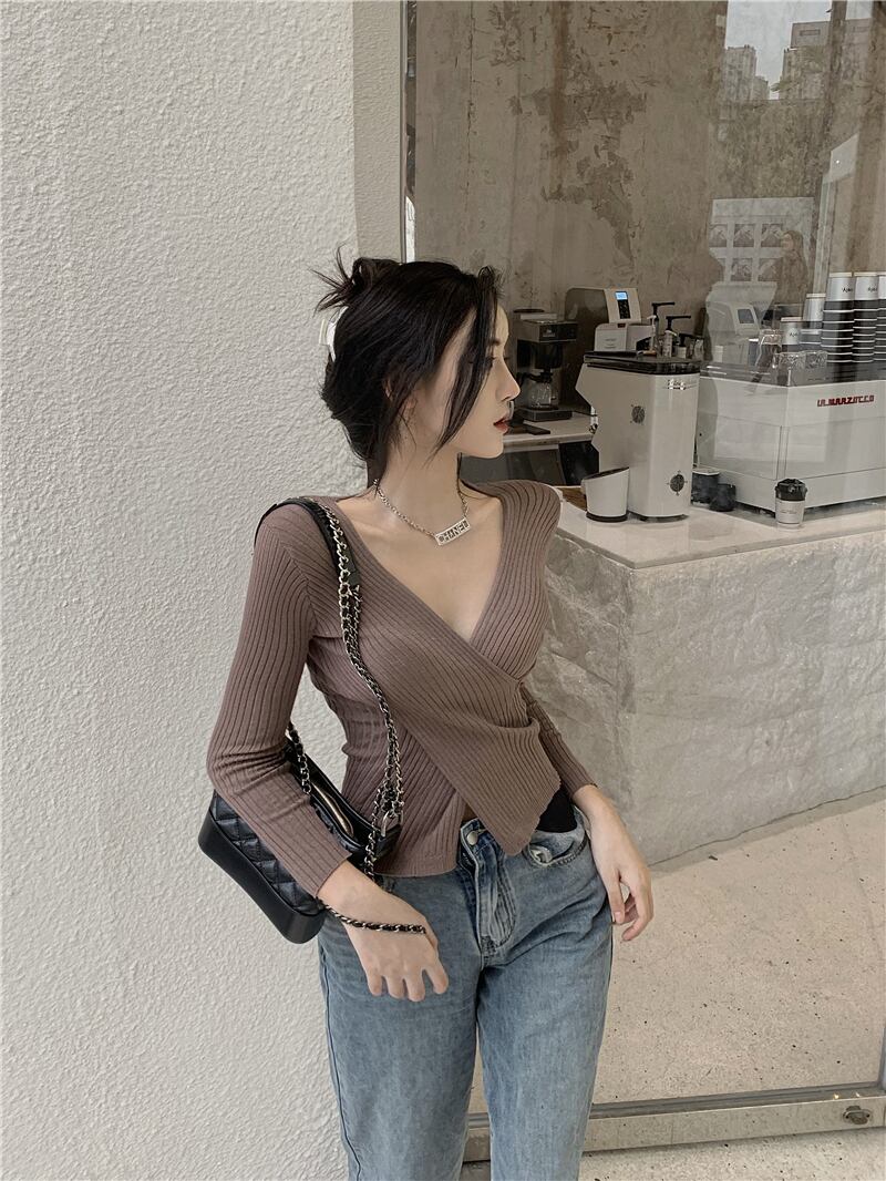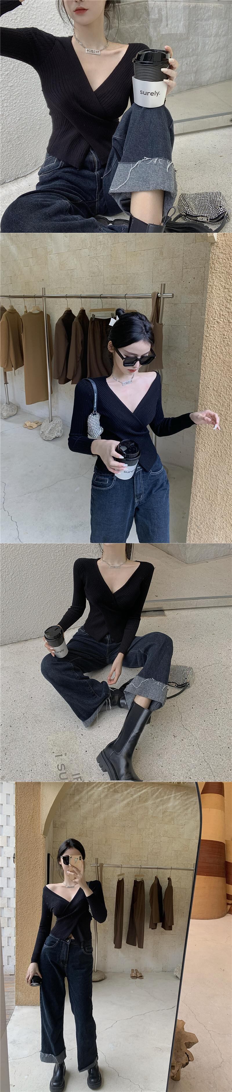 Vネックプルオーバー セーター オータムブラックシャツ ニットトップス ロング 秋物 ドラファッションホール36321060081