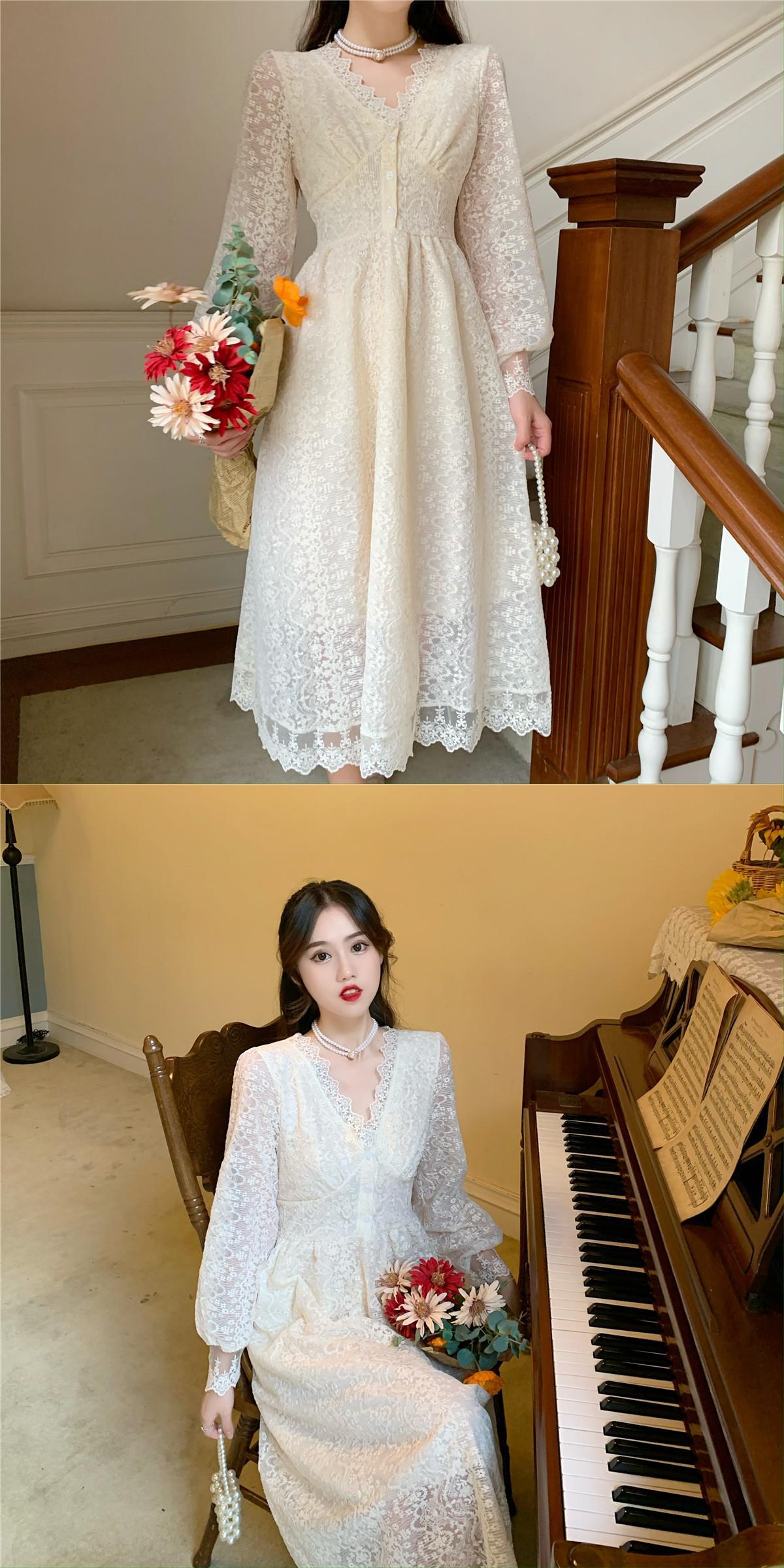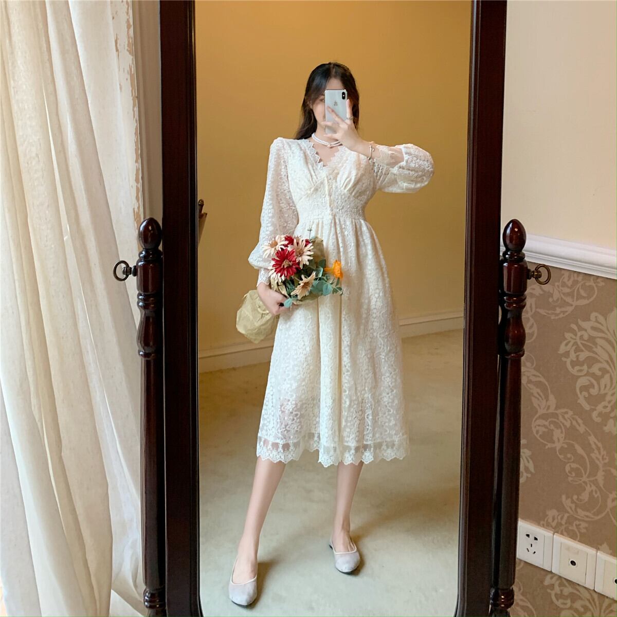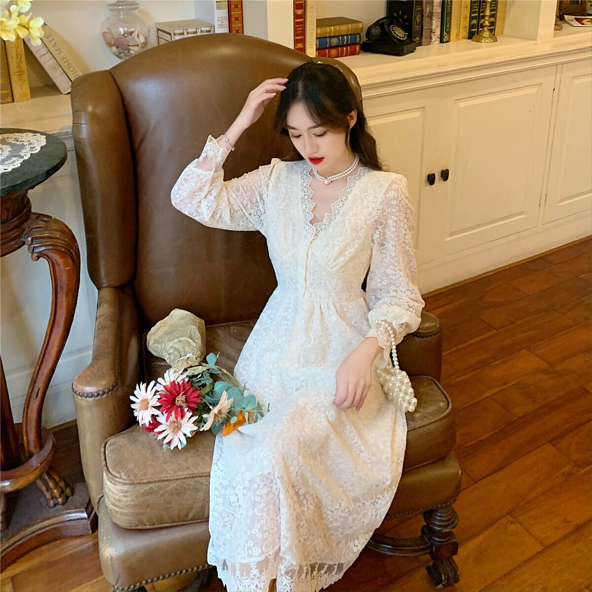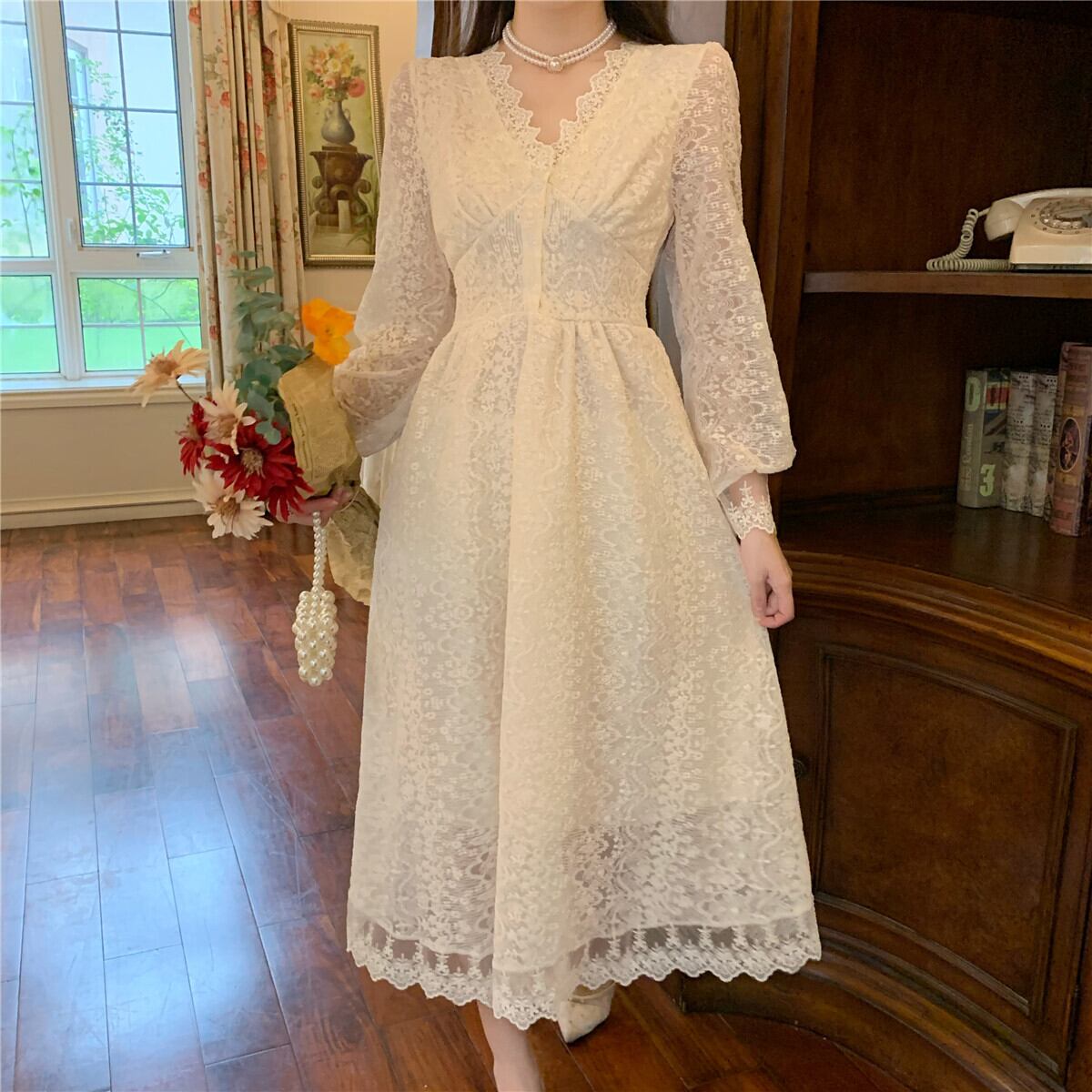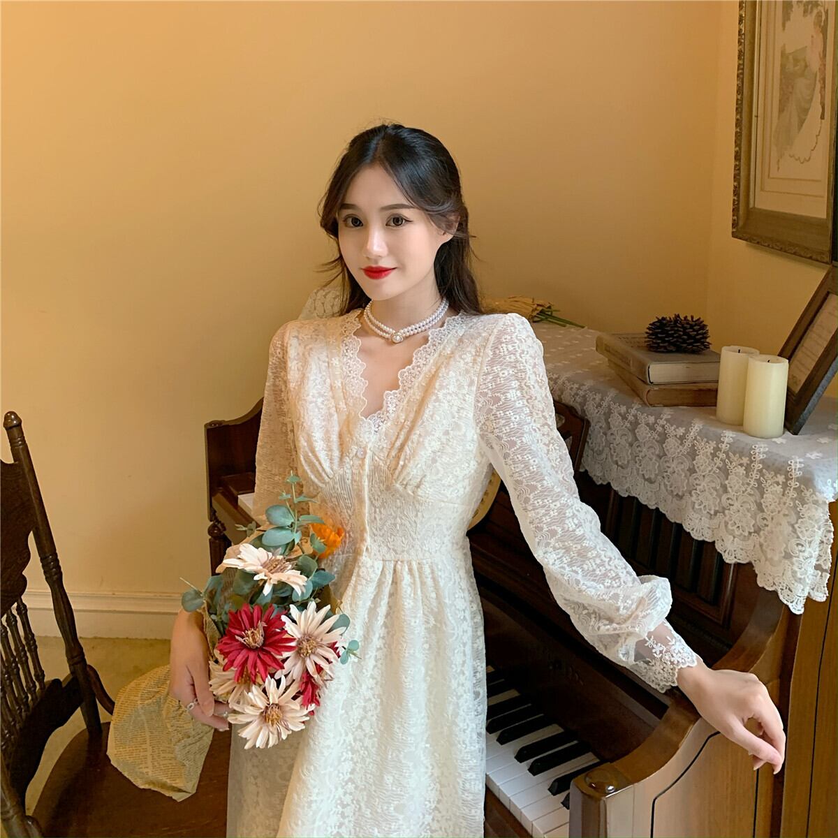 フランスのレトロなVネック中空レース長袖ドレス女性の2020年秋新しいウエストスリムスカート ドラファッションホール55031414985