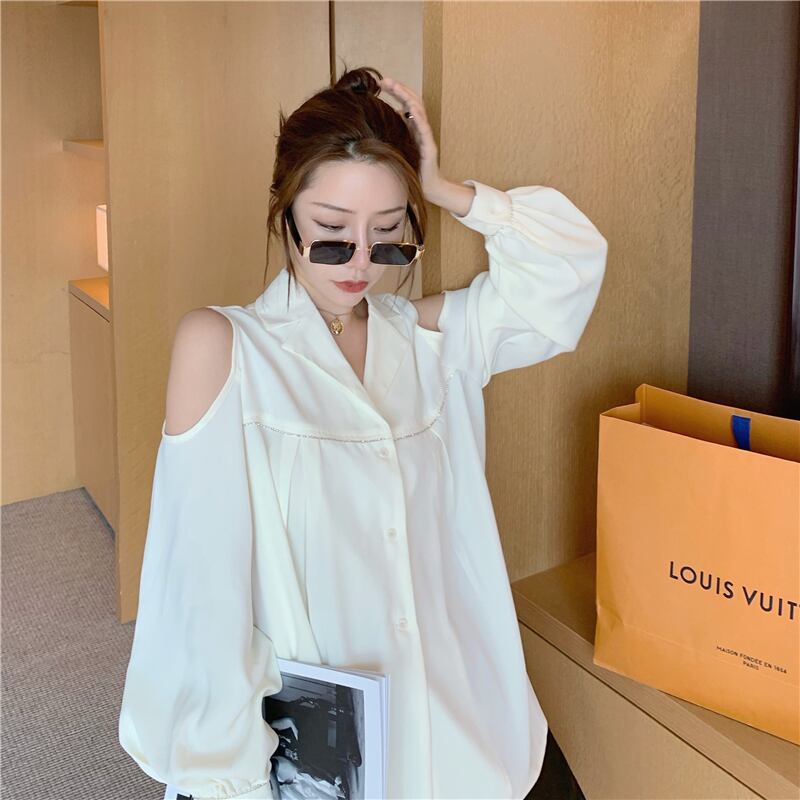 オフショルダーホワイトシャツ女性デザインセンスニッチミドル丈トップス2020年秋新気質オールマッチシャツ ドラファッションホール21664370025