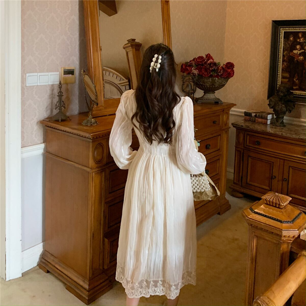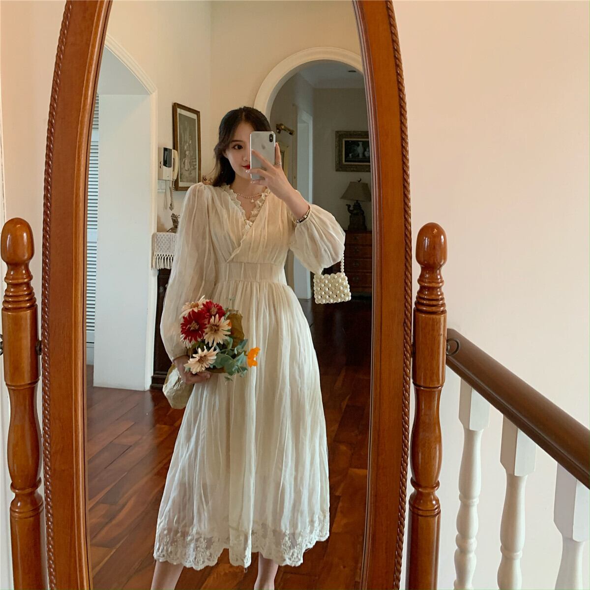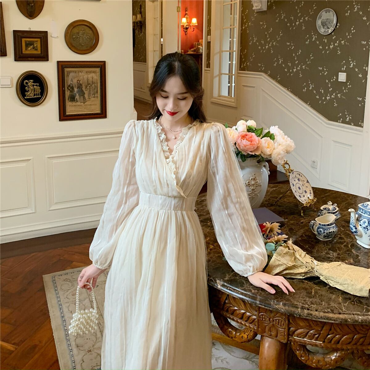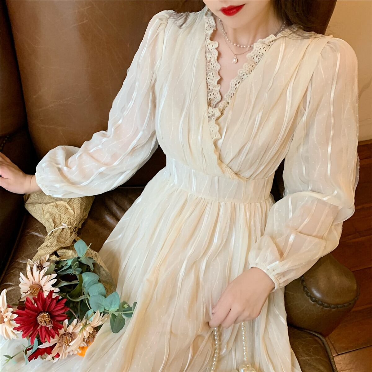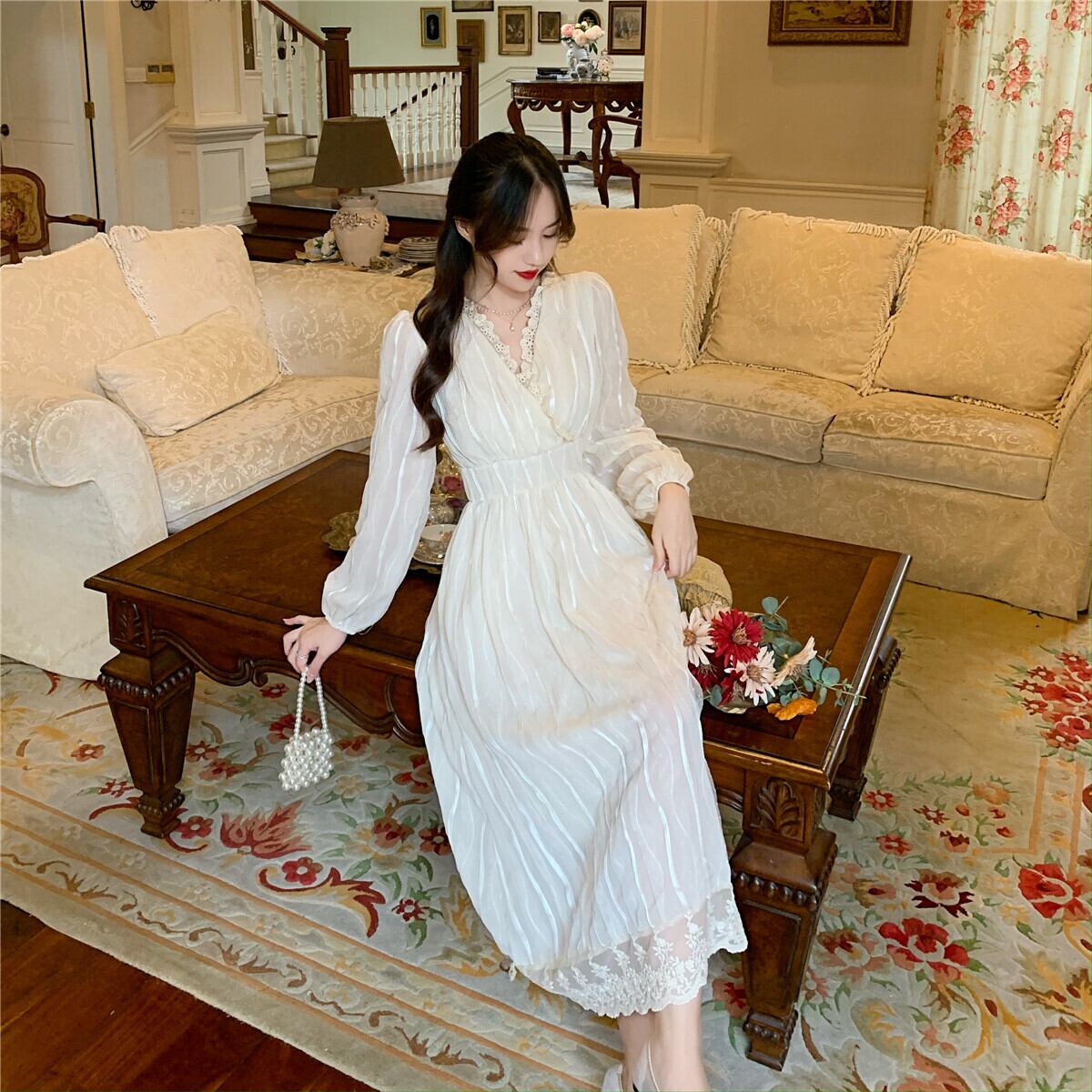 甘いスーパーフェアリーVネックレースフェアリーロングスカート2020年秋新しいウエスト細い優しいドレス女性 ドラファッションホール37343075872