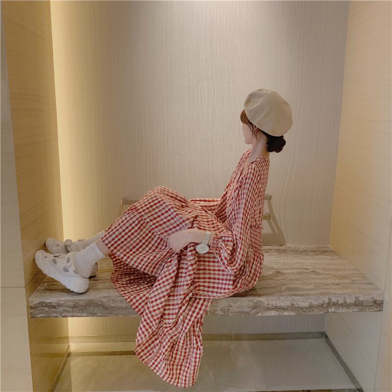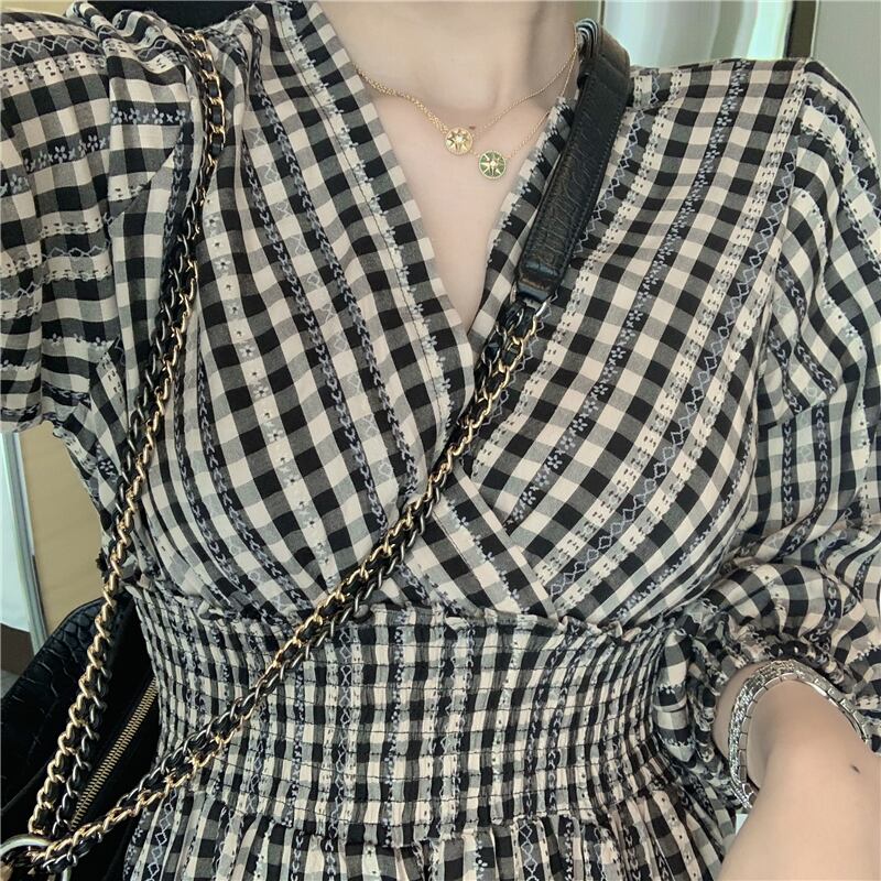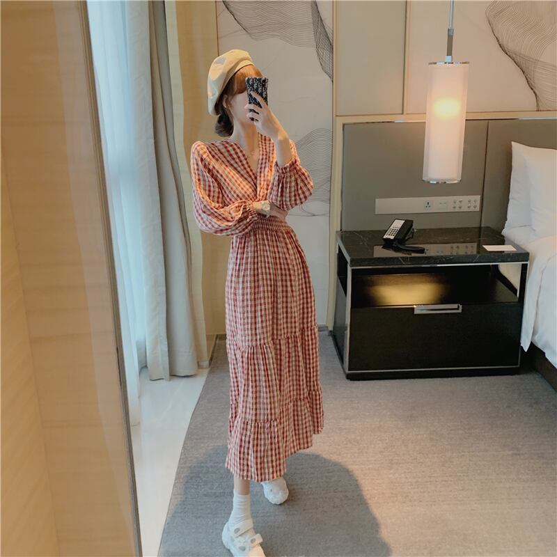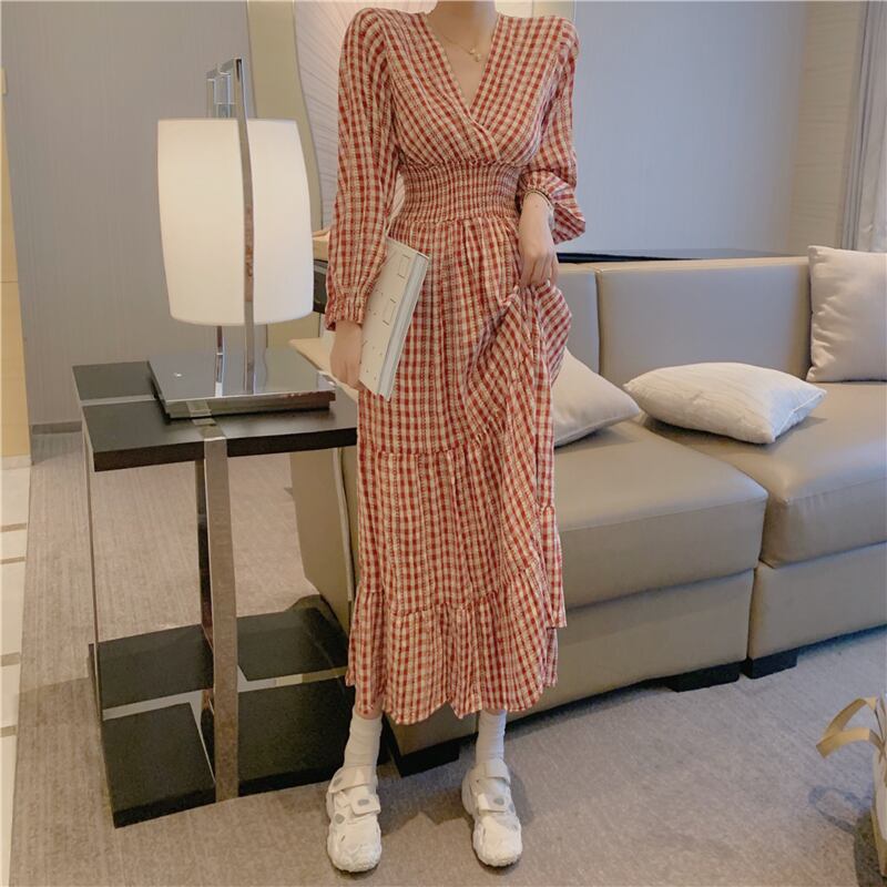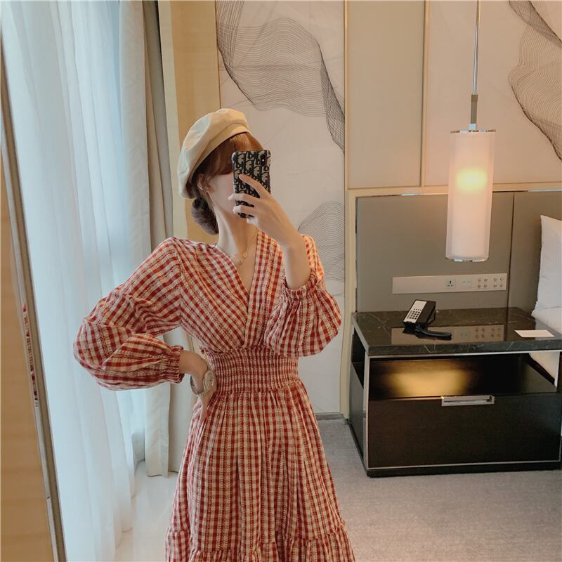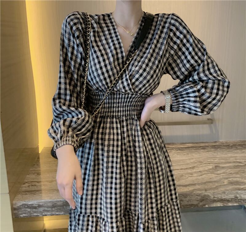 Vネック森長袖ウエストウエストは細くて気質チェック柄ワンピース女性秋新作フレンチレトロロングスカート ドラファッションホール77489312452