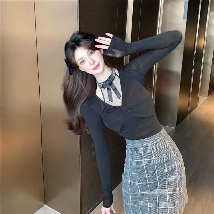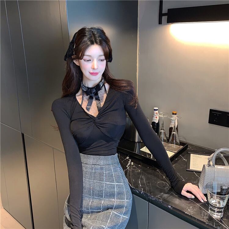 2020年秋新作長袖TシャツレディースVネックフェイクツーピースブラックボトミングシャツスリムスリムセクシーショートトップ ドラファッションホール3229306653