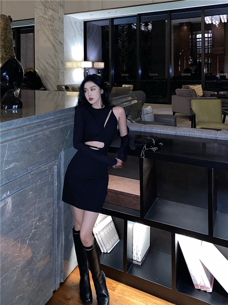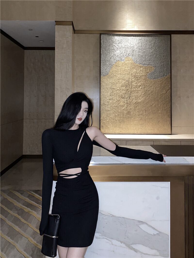 セクシーな小さな黒いTシャツバッグヒップスカートデザインセンスニッチ秋ニューウエストスリムドレス女性 ドラファッションホール92161216680