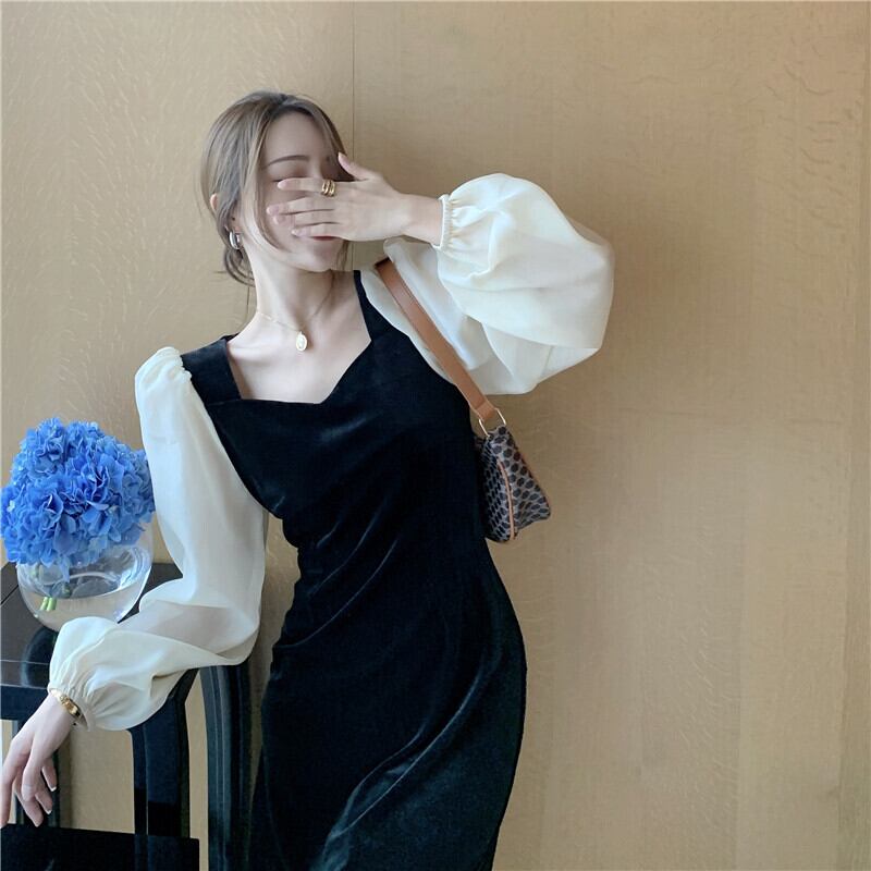 秋の新作フレンチレトロウエストスリミングステッチ長袖ワンピース女性スクエアカラーパフスリーブミドル丈スカート ドラファッションホール59451899540