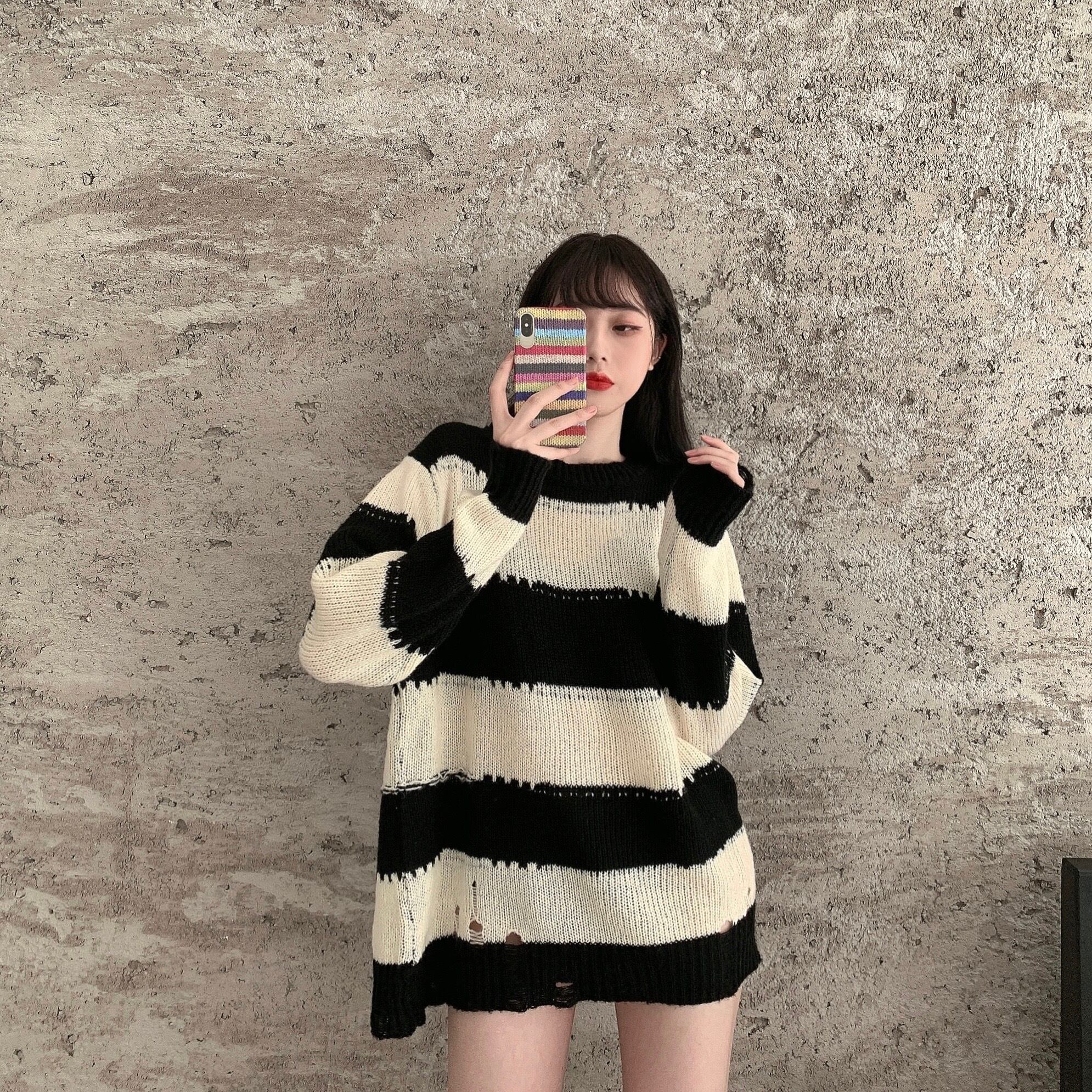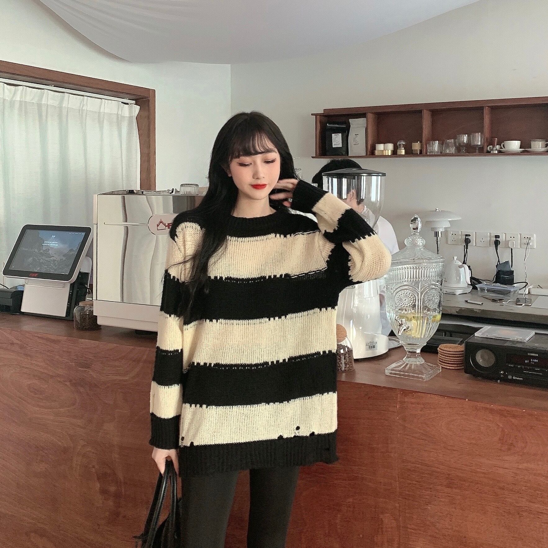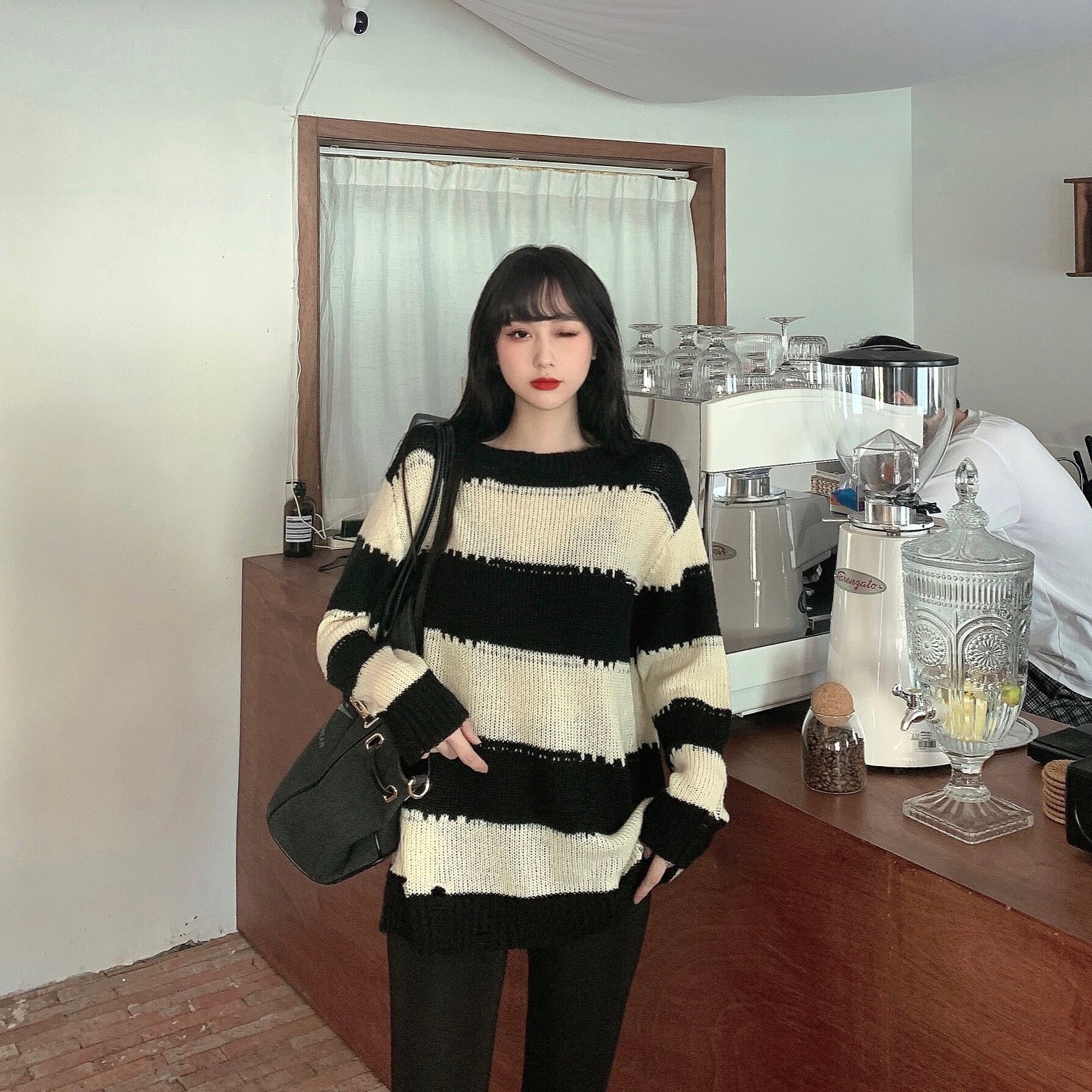 ルーズレイジープルオーバーセーターレディースアウターストライプセーター2020年秋新作ミドル丈ニットトップス ドラファッションホール16857771234
