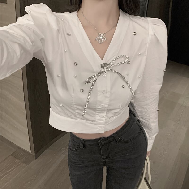 ホワイトシャツレディースデザインセンスニッチ2020年秋ニューウエストショートセクションは薄くてワイルドな長袖トップトレンド ドラファッションホール42724197389