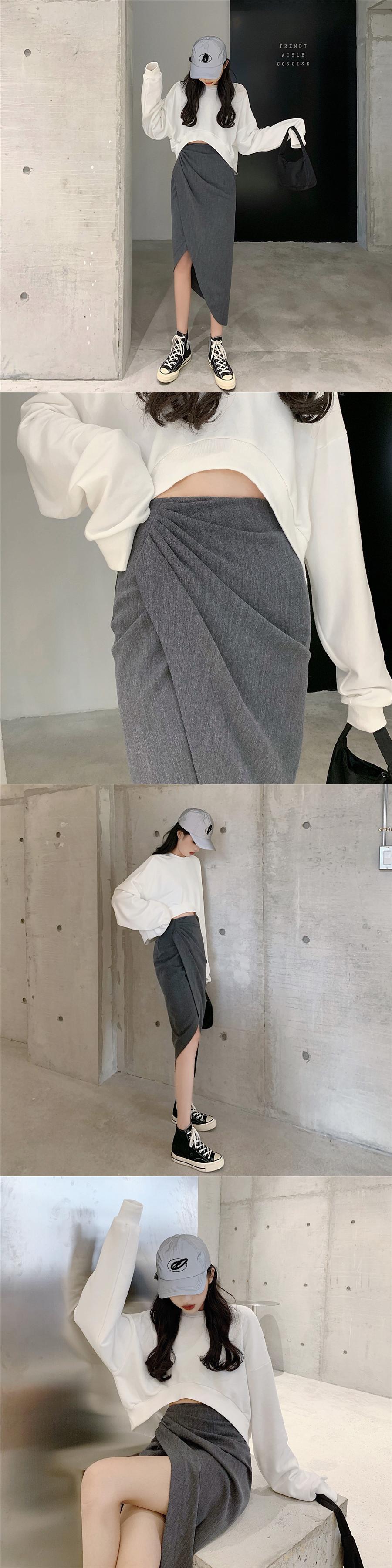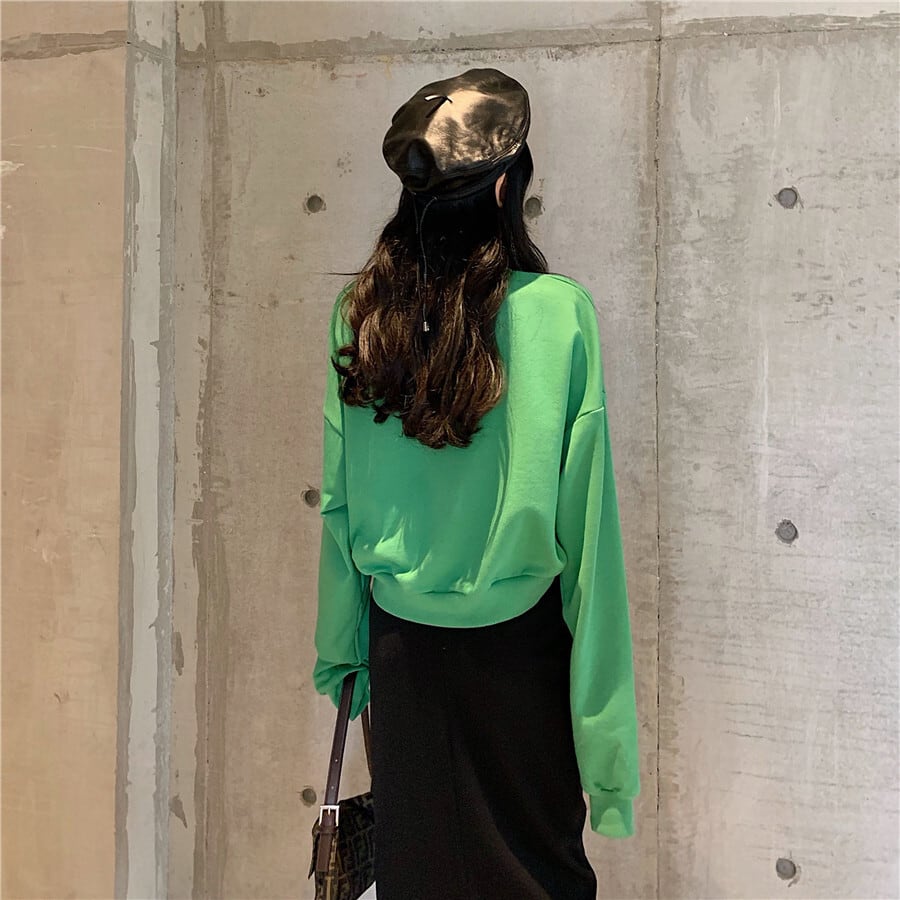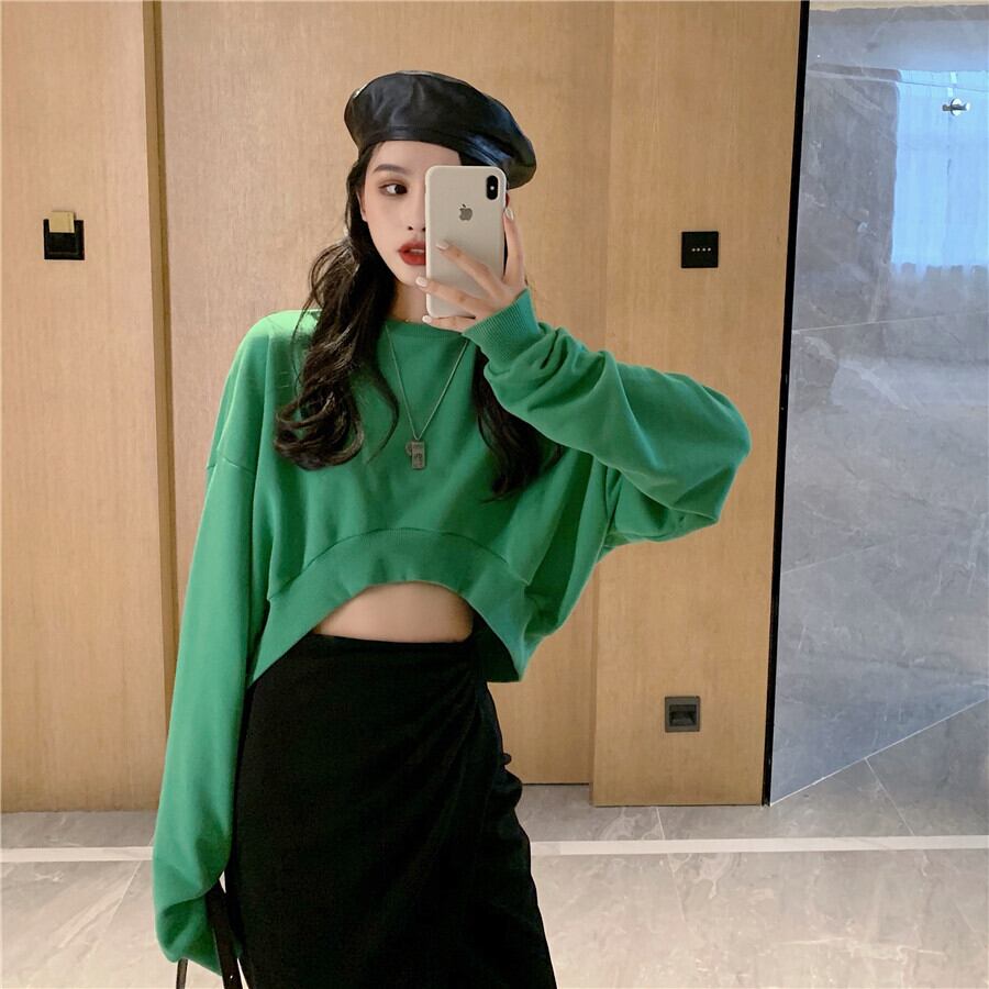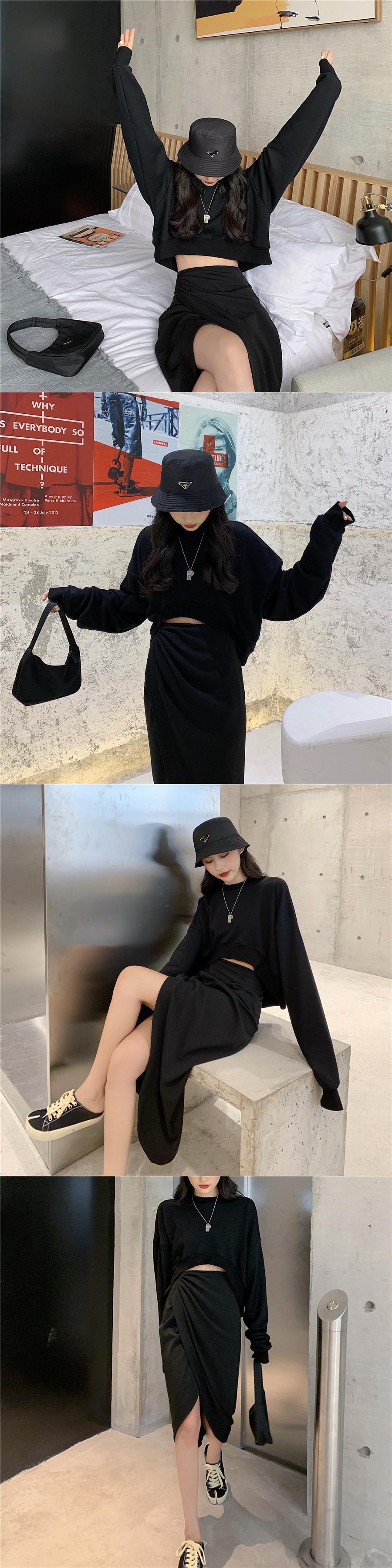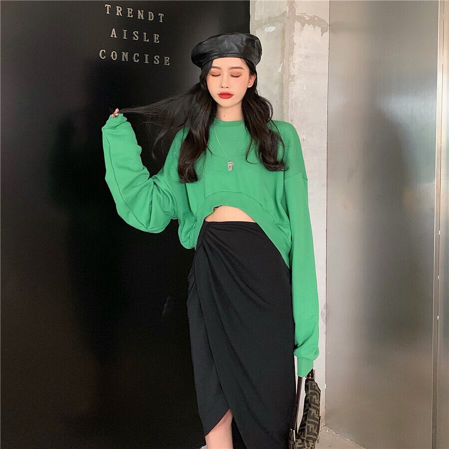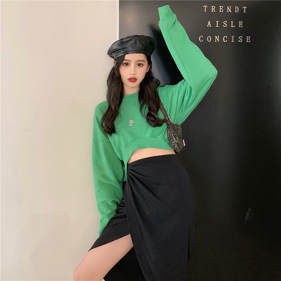 色:短い白いセーター,黒のショートセーター,グリーンクロップドスウェットシャツ,ダークグレーのスプリットスカート,ブラックスプリットスカート