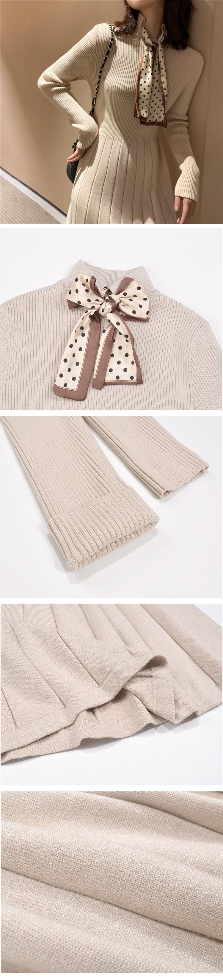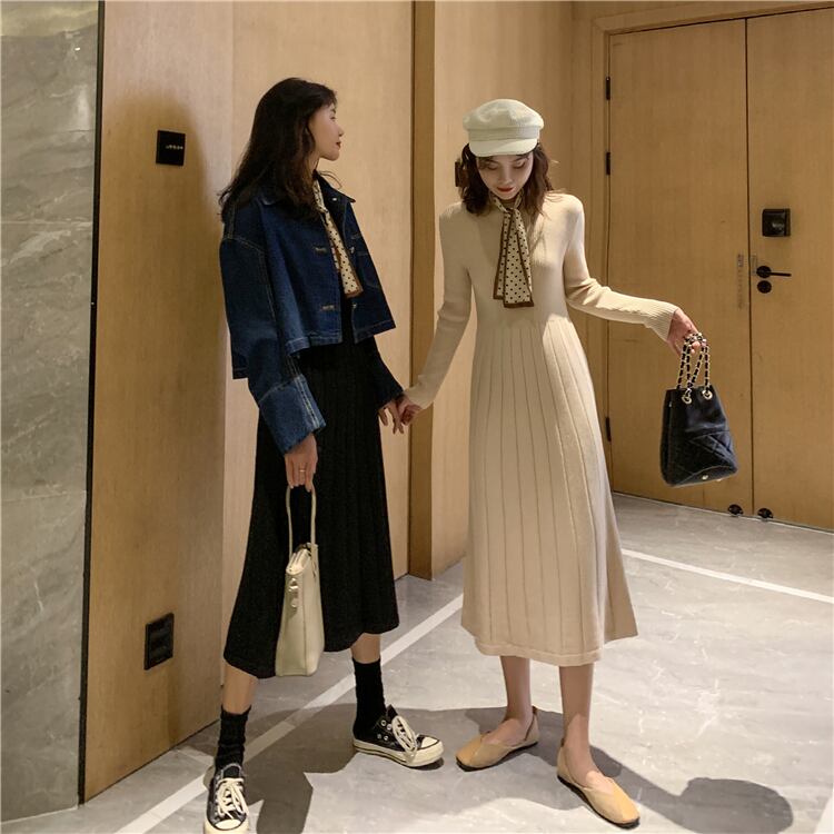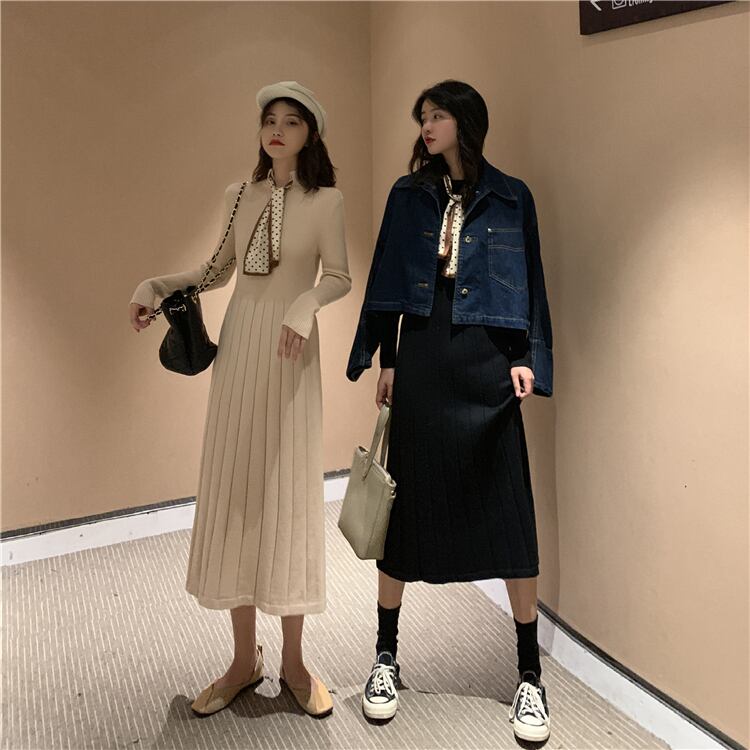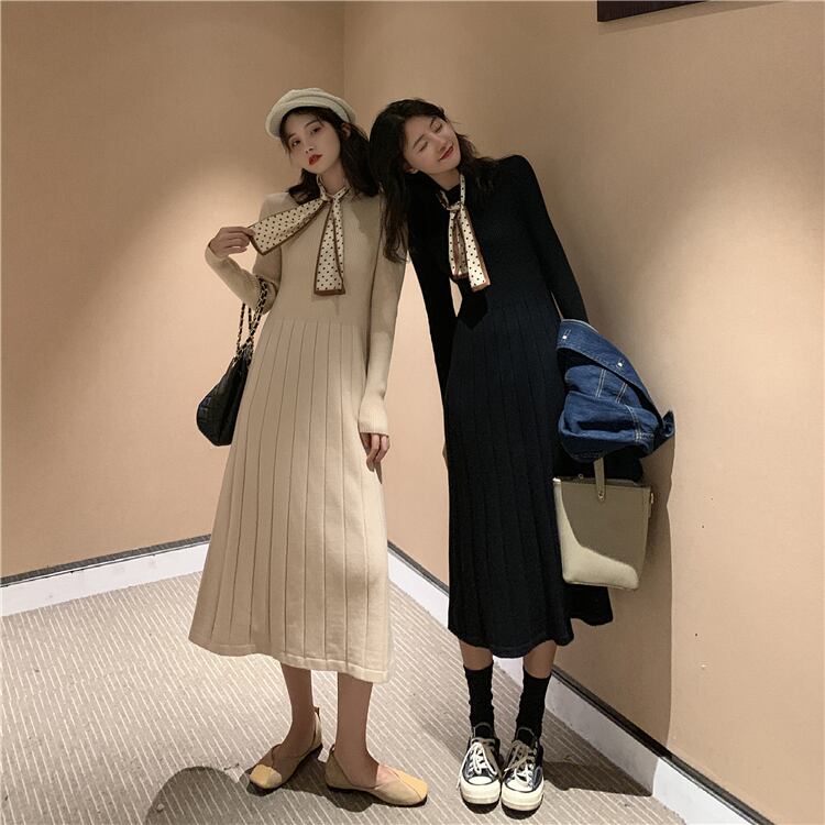 厚みのあるボトミング長袖ニットワンピース女性のウエストは細くて気質2020年秋新作ブラックロングスカート ドラファッションホール71431484096
