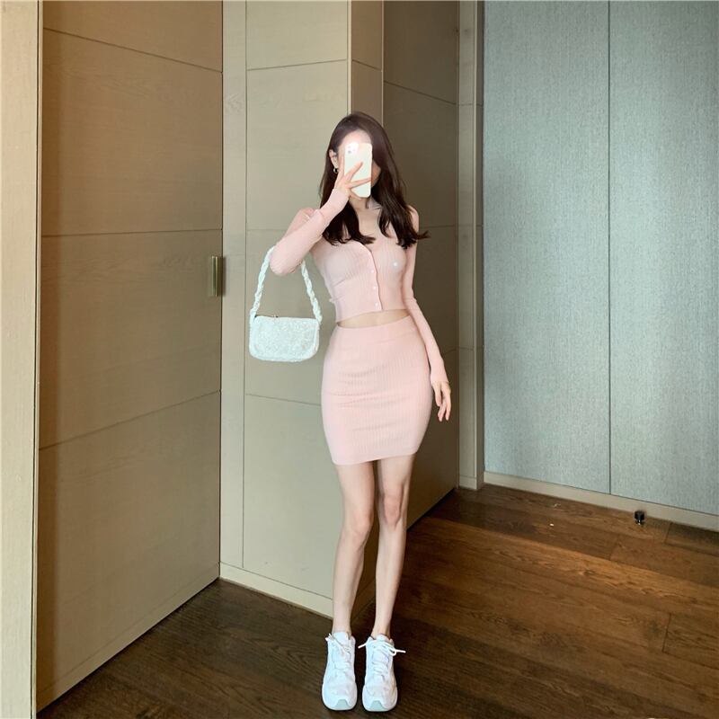 ネットセレブ洋風ニットツーピースセット2020年秋新作ファッションスーツレディースVネックセーターバッグヒップスカートスカート ドラファッションホール37515880267