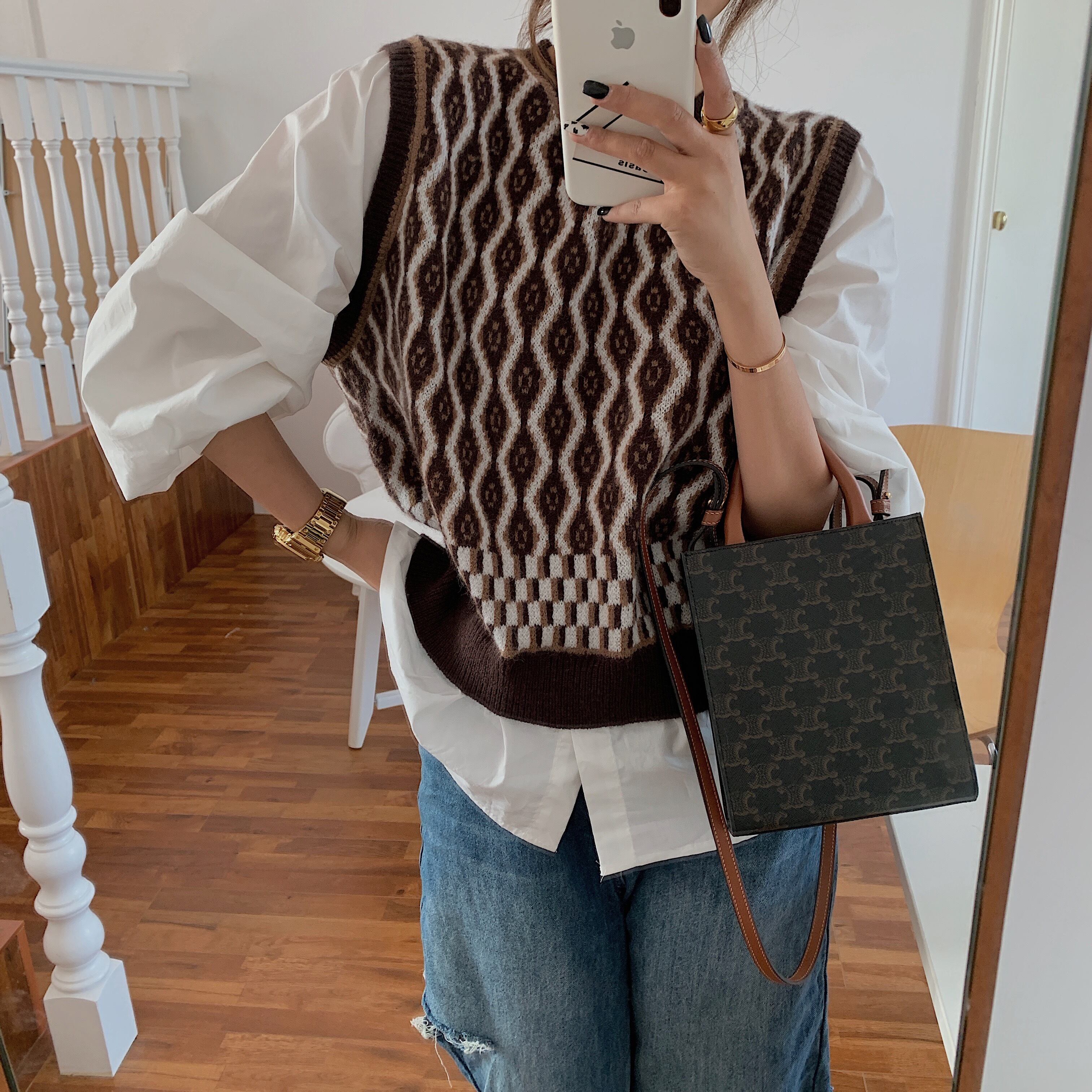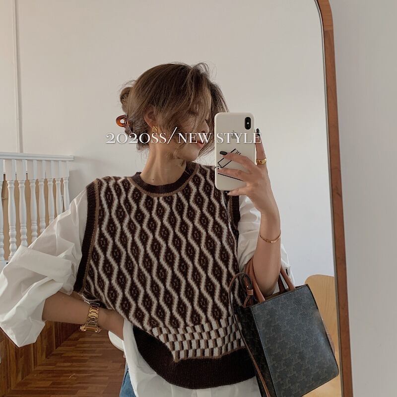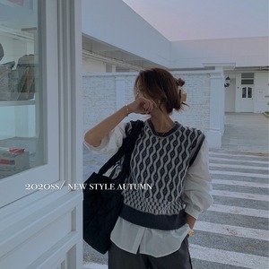 偽のツーピースデザインの白いシャツのステッチニットベスト2020年秋新しい女性のルーズな長袖トップ ドラファッションホール59946263612
