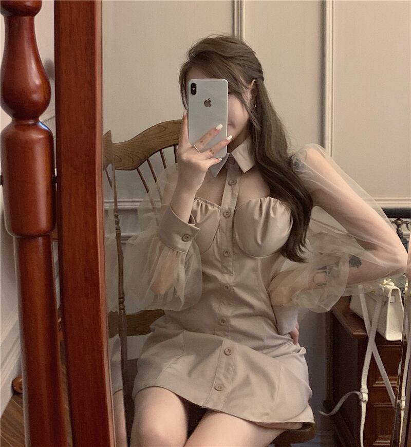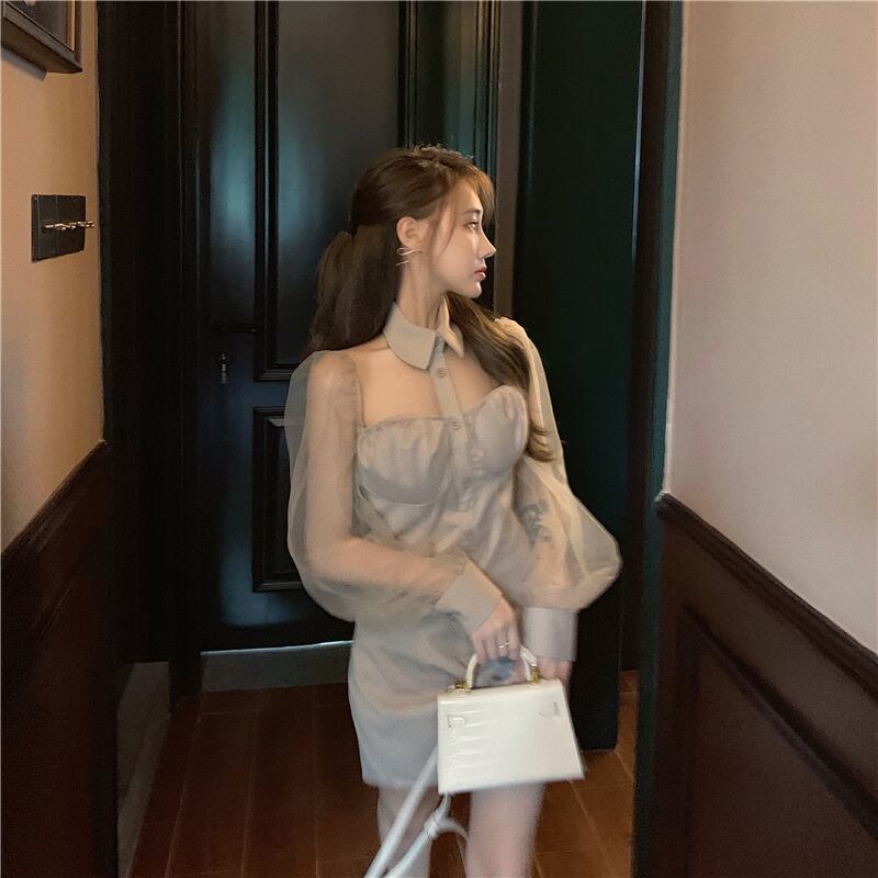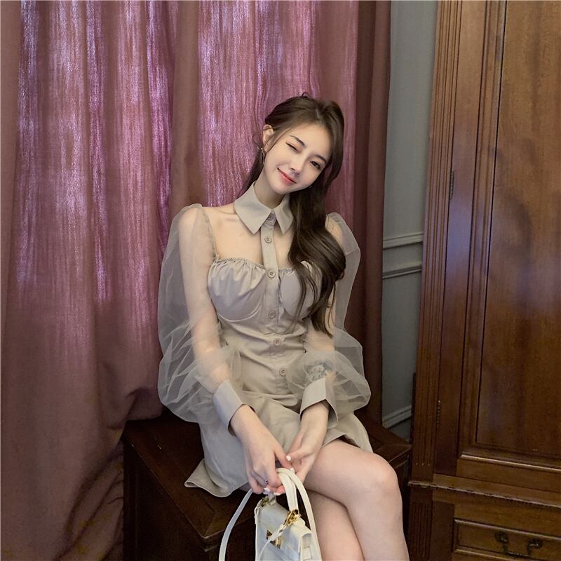 長袖ネット糸ステッチワンピース女性デザインセンスニッチ2020年秋ニューウエストスリムスカート ドラファッションホール91323481635