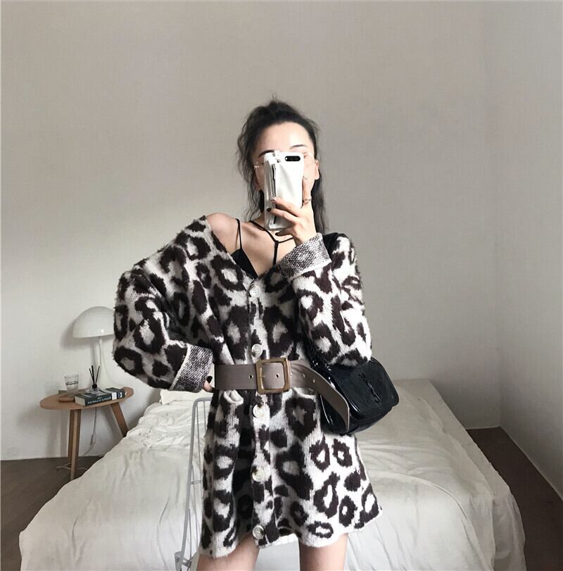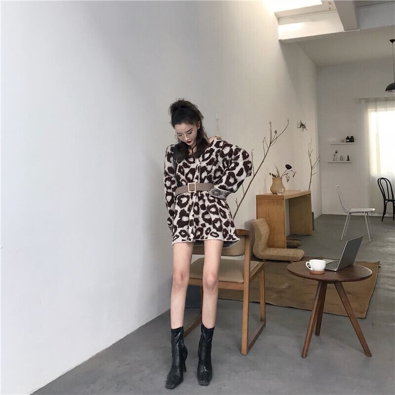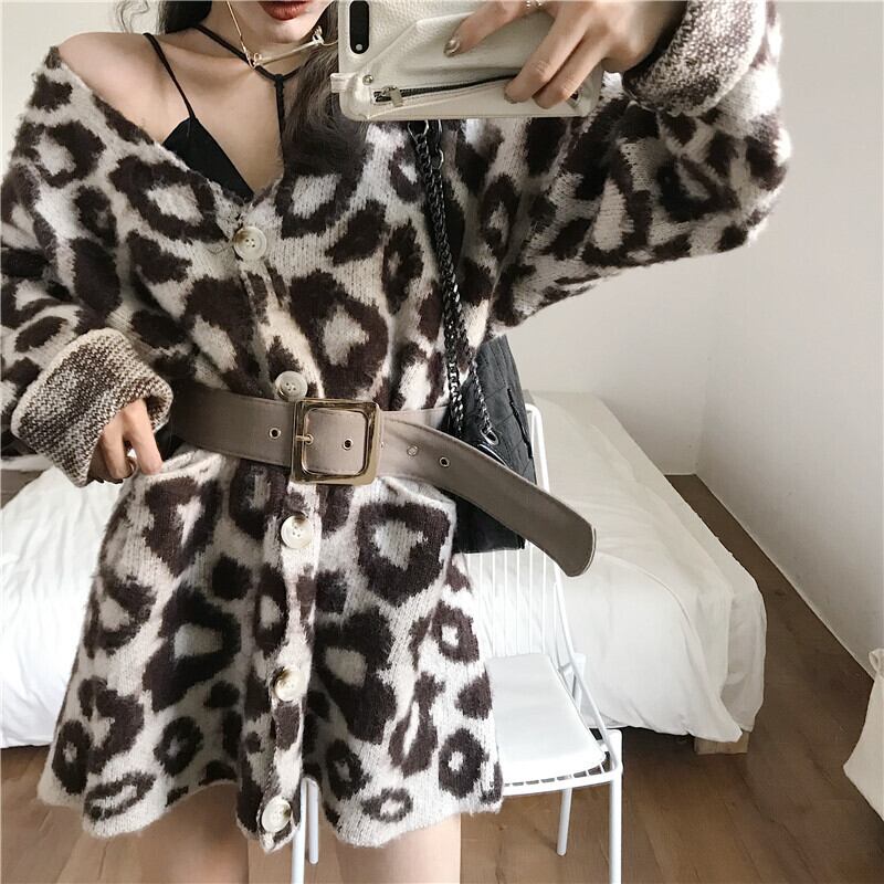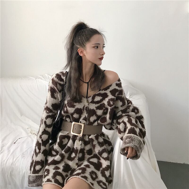 ヒョウ柄モヘアセーターベルト付き女性2020年秋新作優しい風ルーズアウターニットカーディガンジャケット ドラファッションホール55133589222