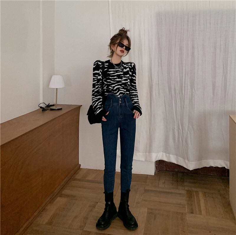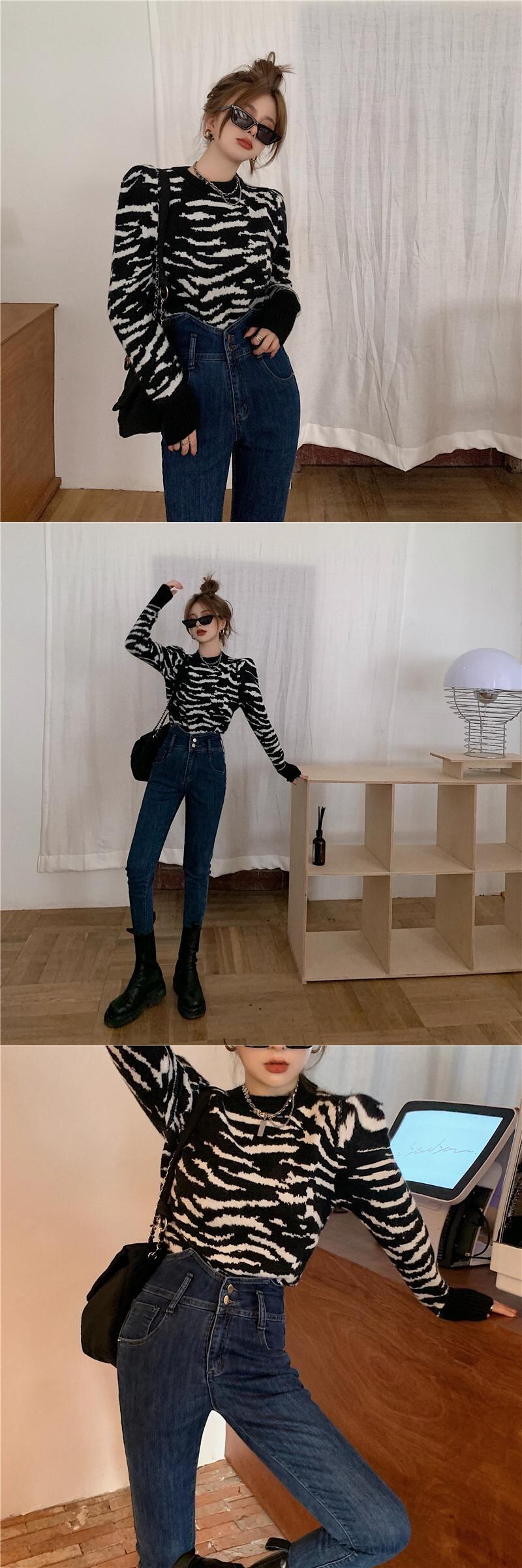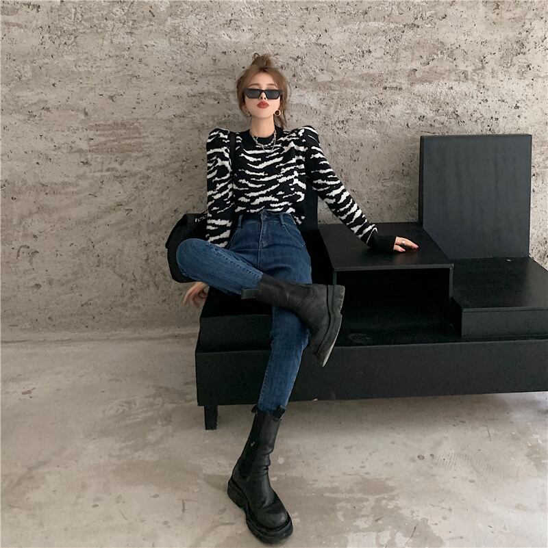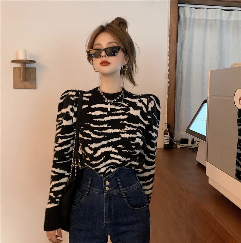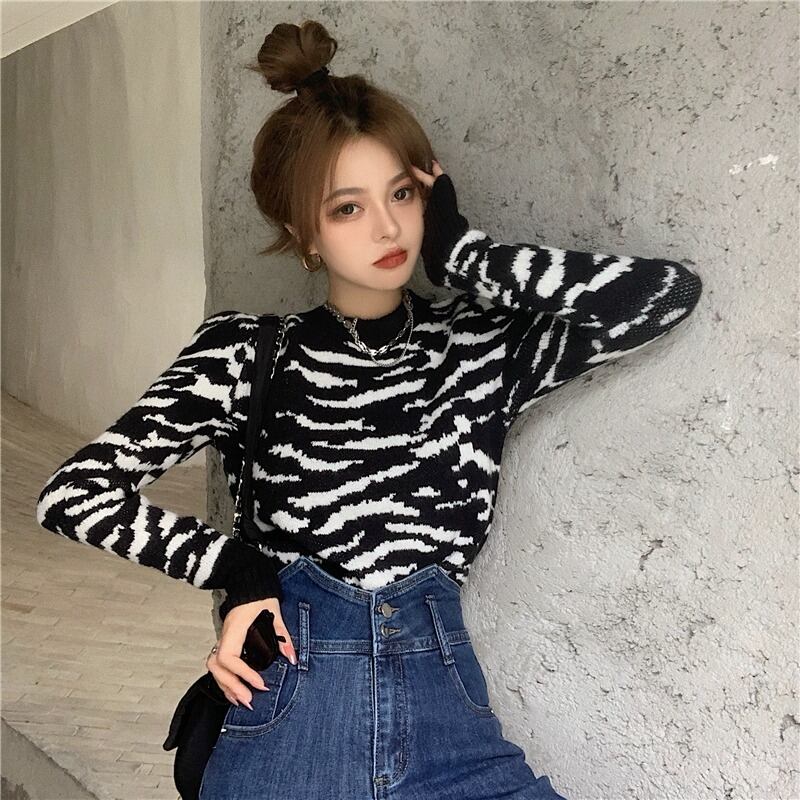 ゼブラパターンラウンドネックプルオーバーセーター女性2020年秋新しいスリムで薄い野生の長袖ニットトップ女性 ドラファッションホール78295321463