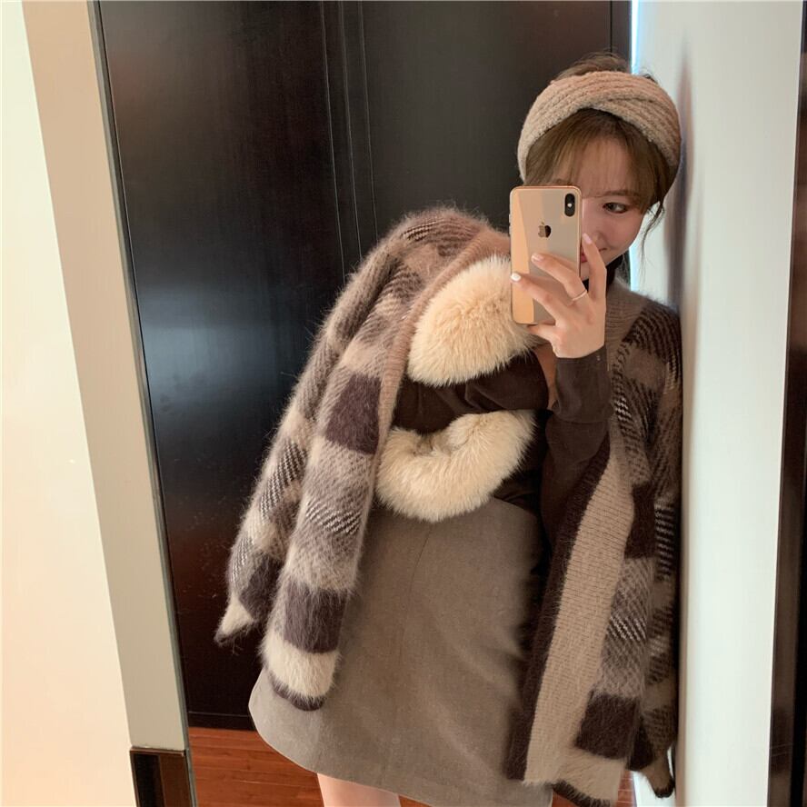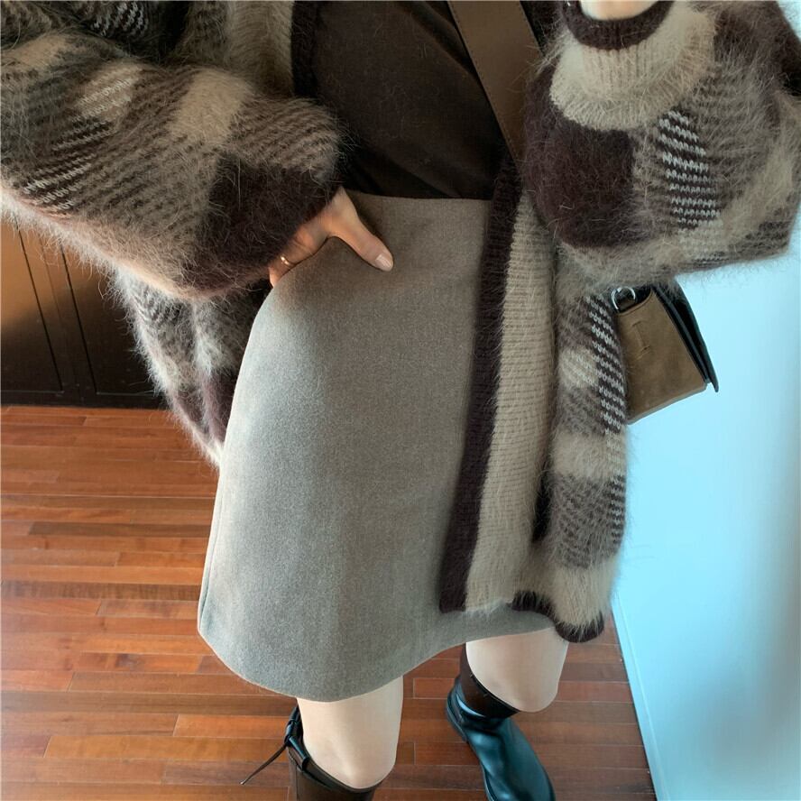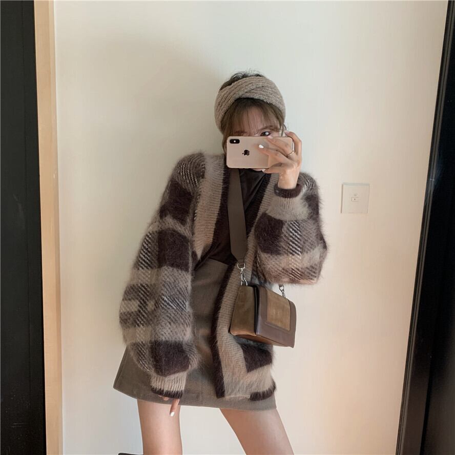 色:チェック柄セーターカーディガン,茶色のスカート,ダークコーヒーカラーのボトミングシャツ