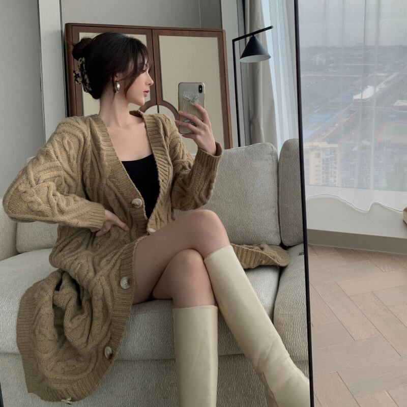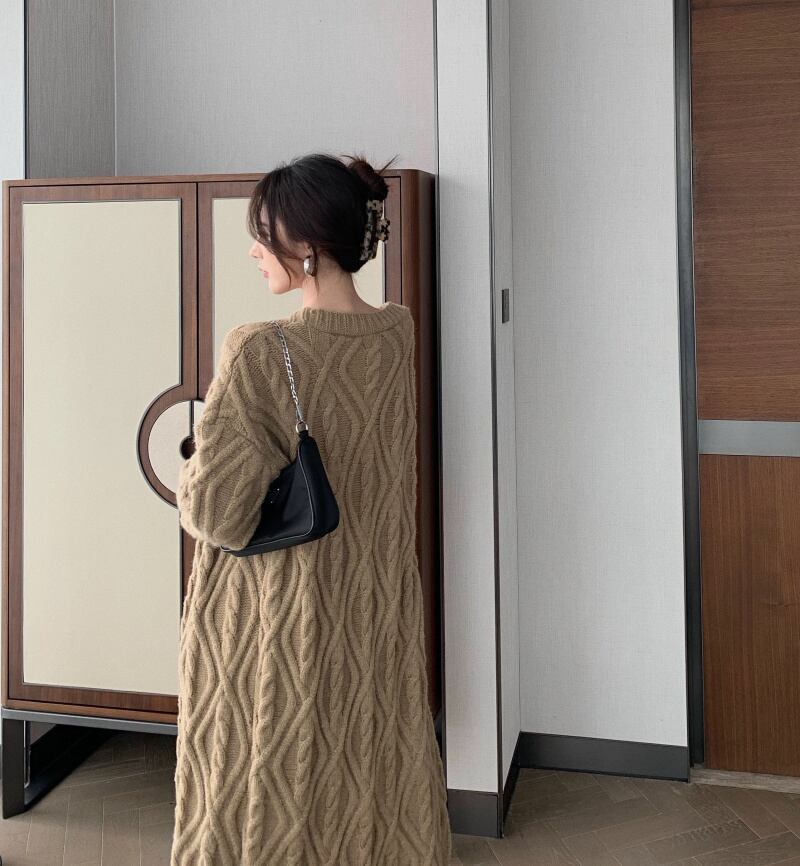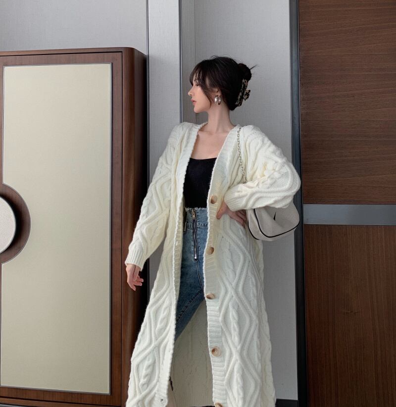ツイストVネックセーターコートレディース2020年秋冬新作スタイルルーズレイジーウィンドミドル丈ウエスタンスタイルニットトップス ドラファッションホール39915990400
