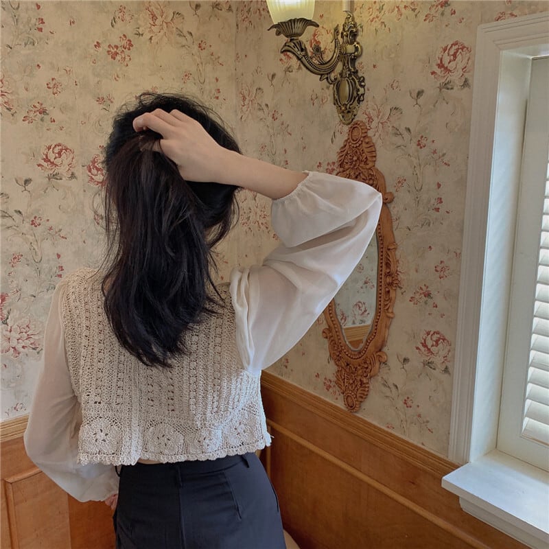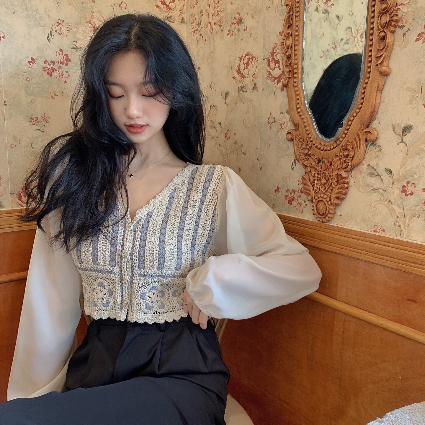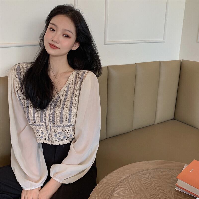 2020年秋ニュースタイルホローVネック長袖シフォンシャツレディースエインスタイルスモールシャツオールマッチショートトップインタイド ドラファッションホール9083941164