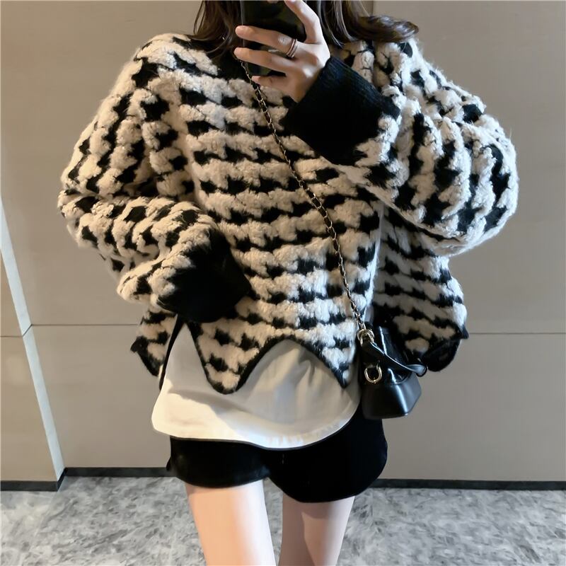秋冬のパッド入りプルオーバーレディース2020新しい千鳥格子ルーズで怠惰なニットセーターウエスタンスタイルの長袖トップ ドラファッションホール87799259879