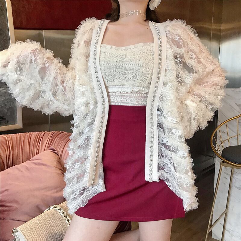 色:レースジャケット,ベージュのスリング,赤いスカート