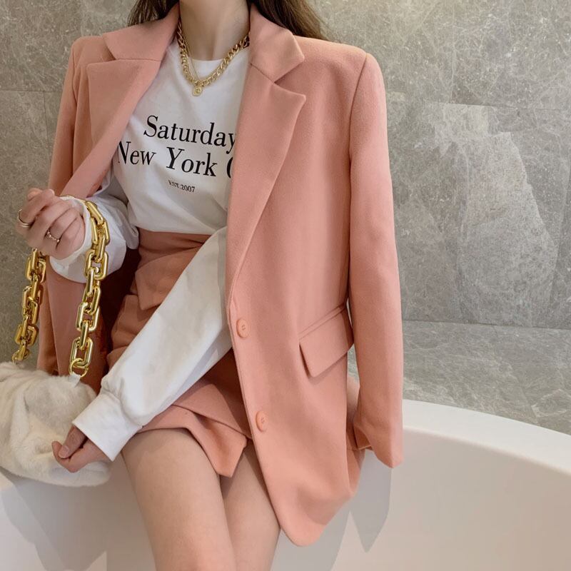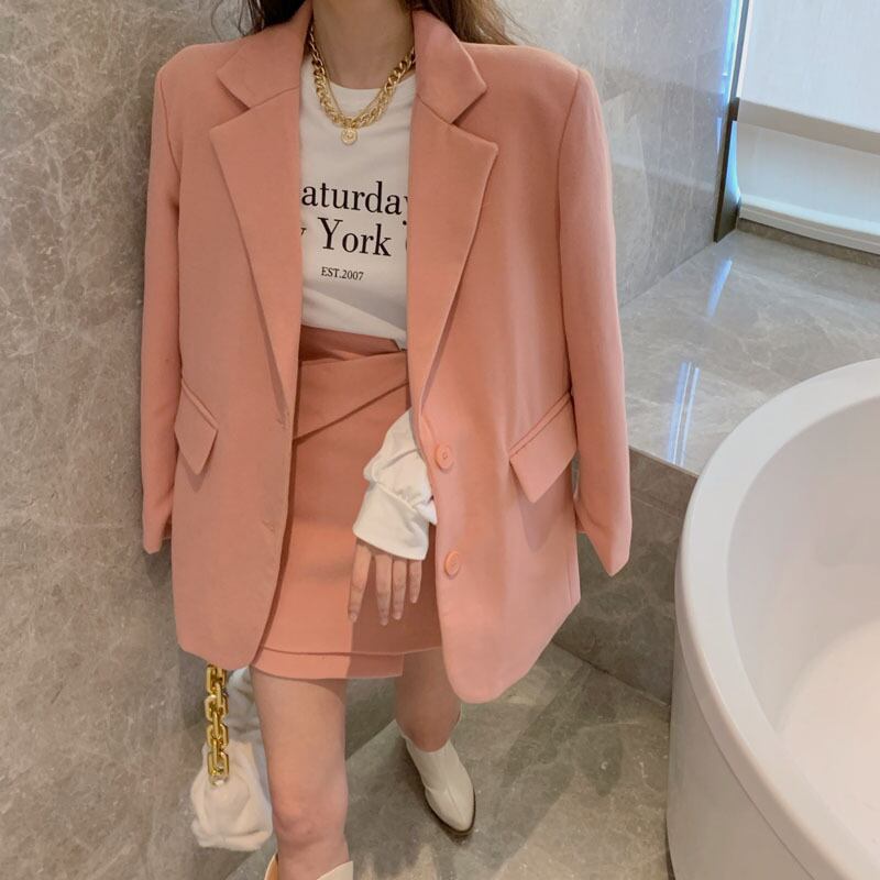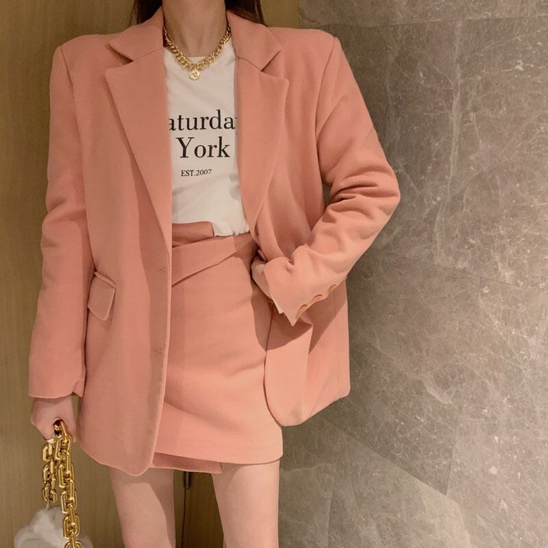 色:オレンジピンクのウールブレザー,オレンジピンクのスカート,ホワイトベース