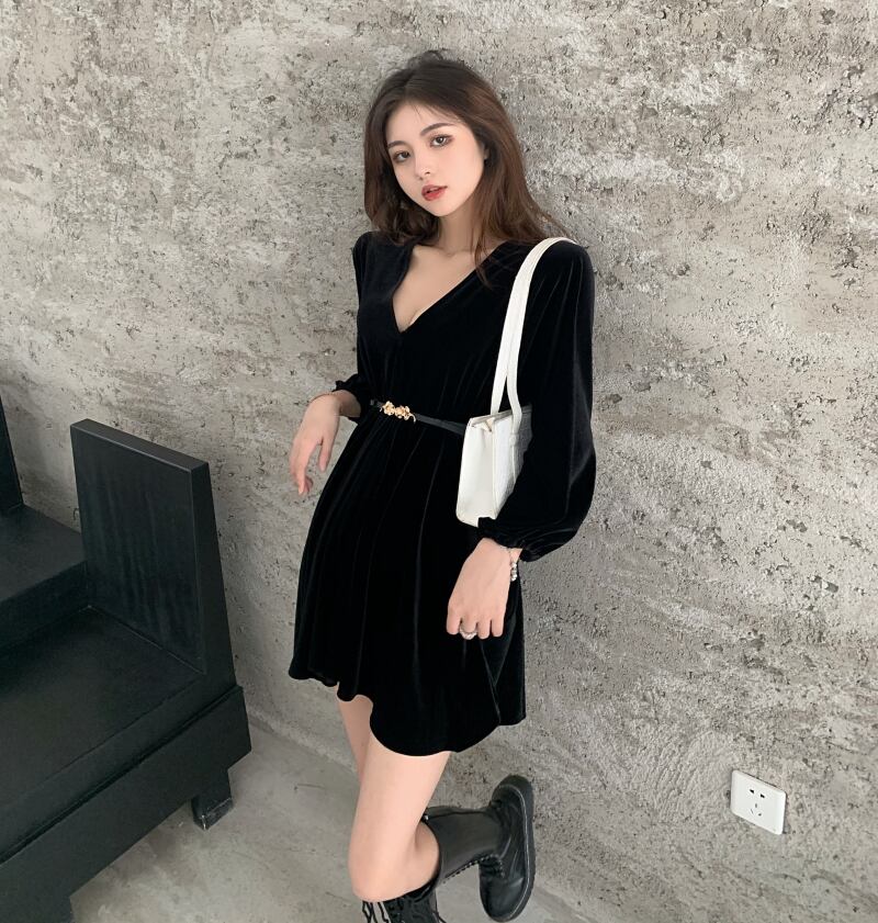 スタンダードウェストスリムブラックベルベットドレス レディースオータムウィンターソリッド カラースカート レトロ 秋物 冬物 ソリッドカラー ドラファッションホール90064359364