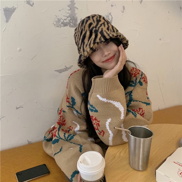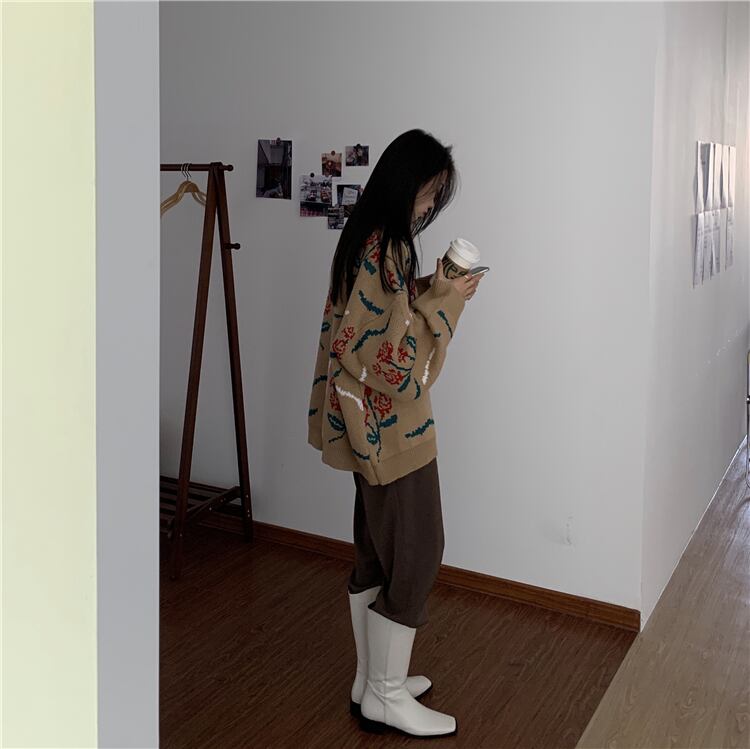 スタンダードセーター レディースオータムウィンターラウンドネックプリント薄手パターンルーズトップス レトロ 秋物 冬物 Oネック ドラファッションホール4861841386