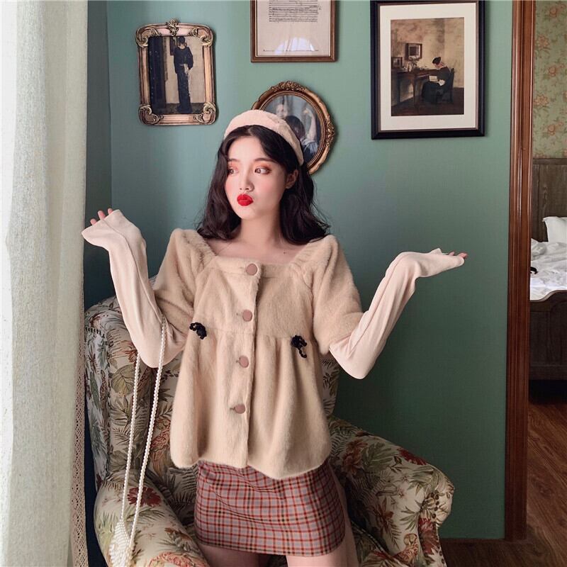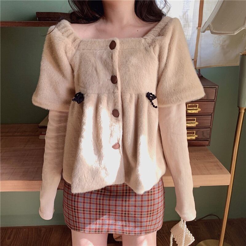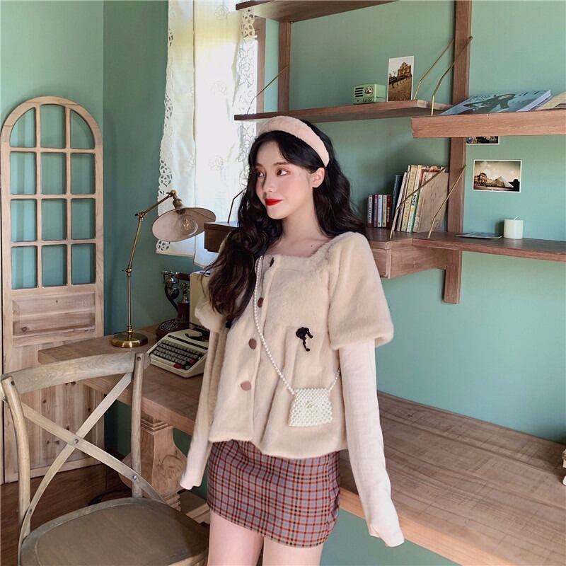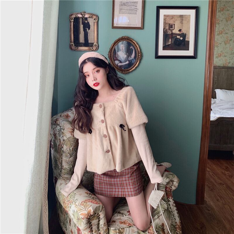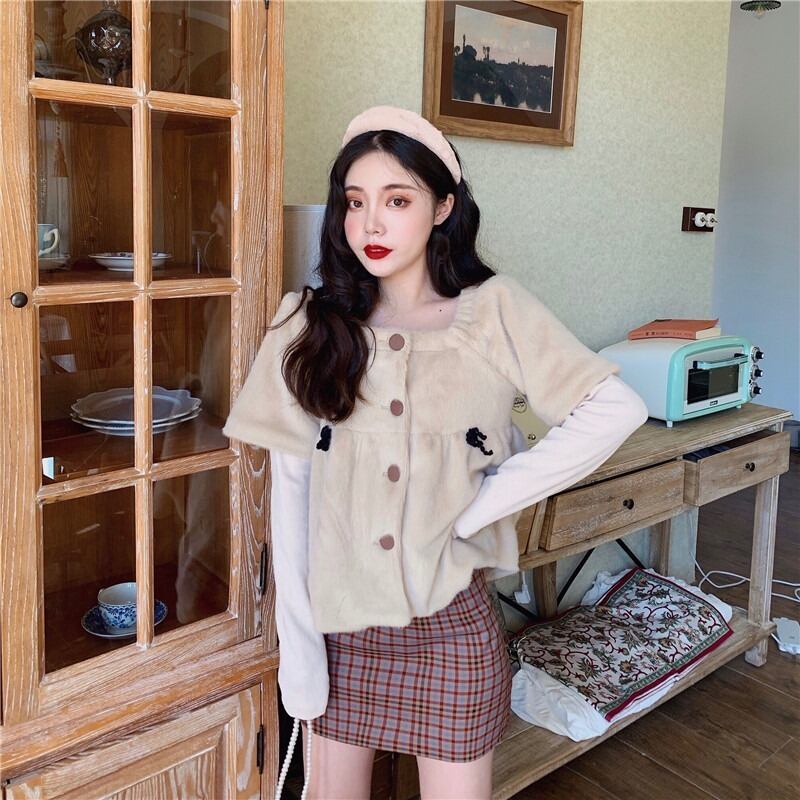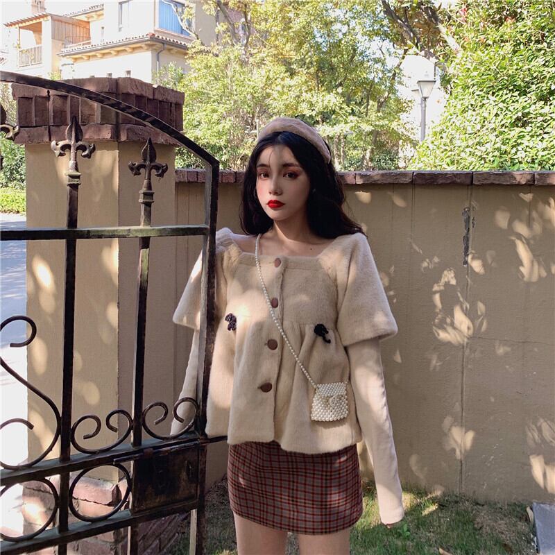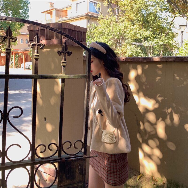 色:パッチワークぬいぐるみジャケット,レッドチェックスカート