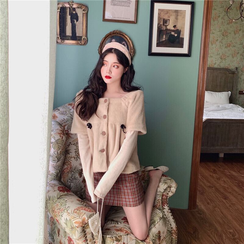 カラーカーディガンジャケット Aライン格子柄スカート スクウェア ステッチ ドラファッションホール1407525668