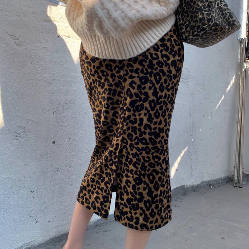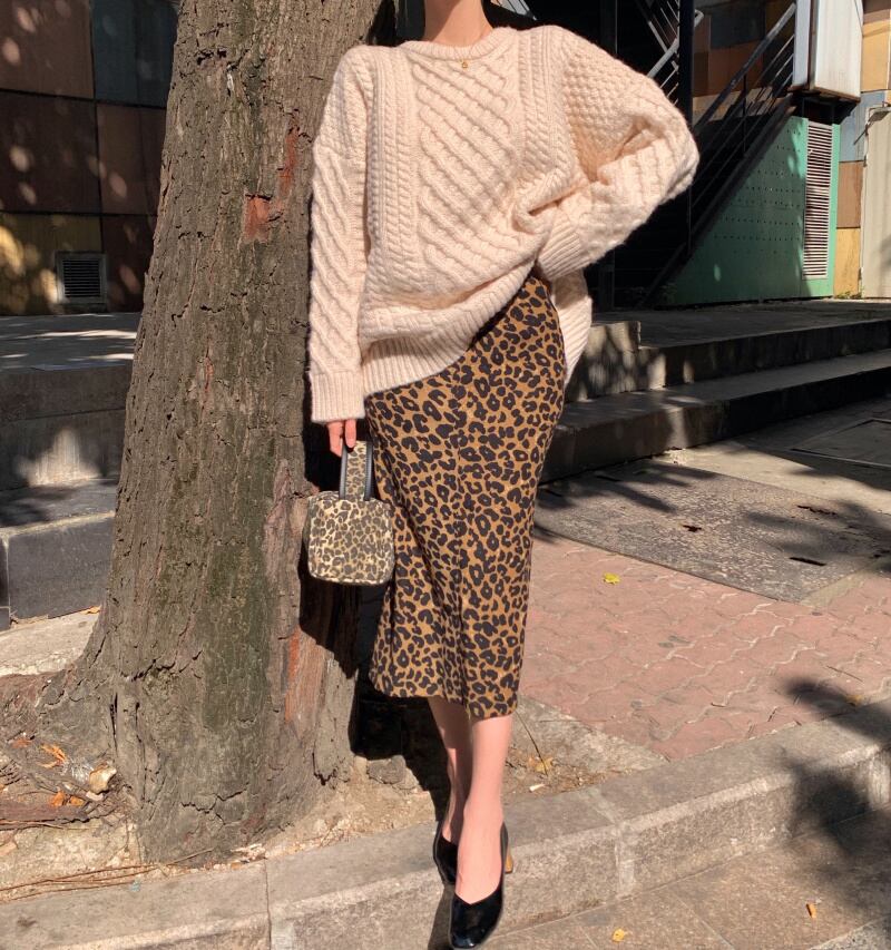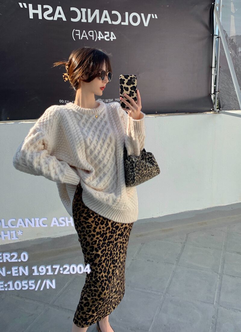 ルーズニットラウンドネックトップス レオパードプリント柄スカート Oネック ドラファッションホール11365595493