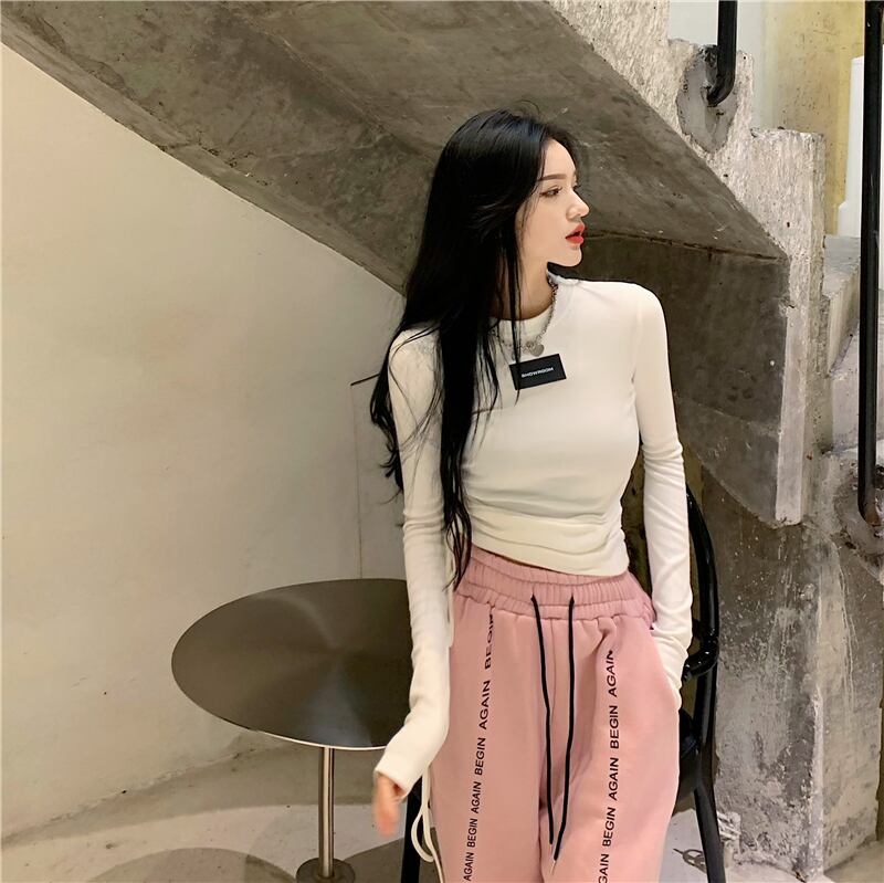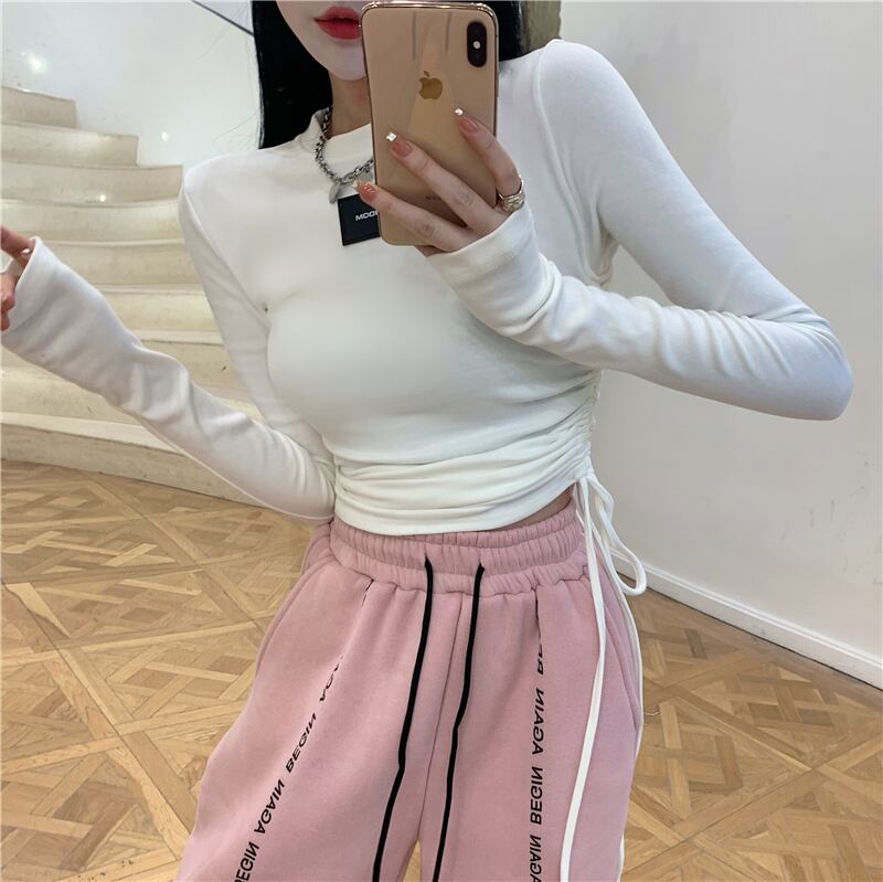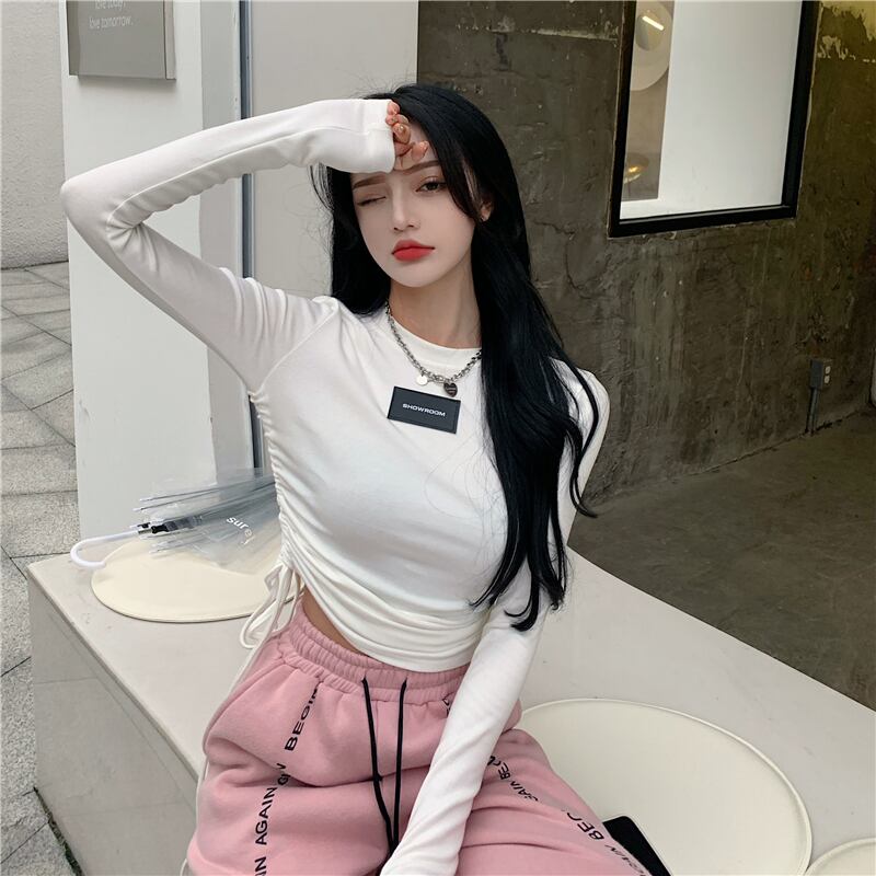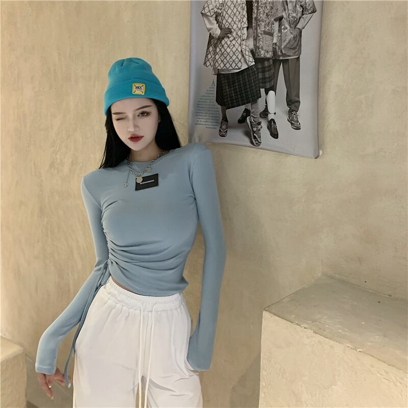 ラウンドネックギャザーTシャツ レディースオータムウィンターソリッド カラースリムフィットショート レース 秋物 冬物 Oネック レースアップ ソリッドカラー ドラファッションホール24761139736