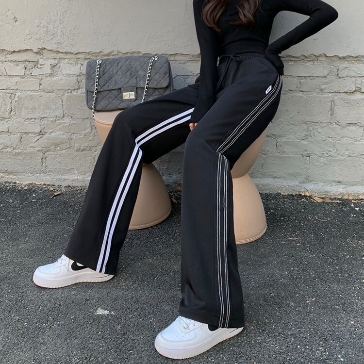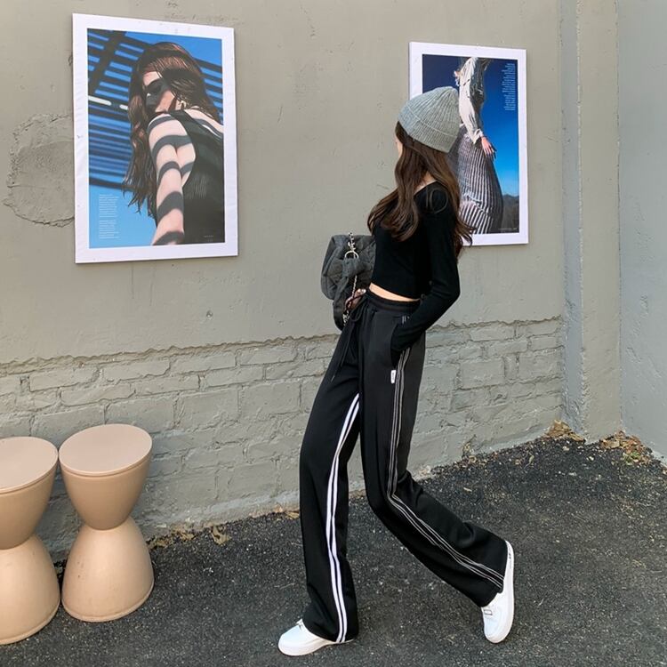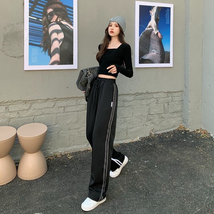 パンツ オータムウィンタースタイルストライプカジュアルハイウェストウェストワイドレッグブラックルーズ 秋物 冬物 ワイドパンツ ドラファッションホール98534418183