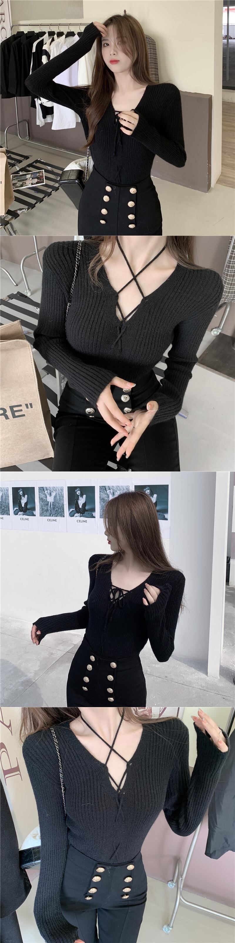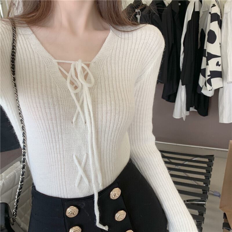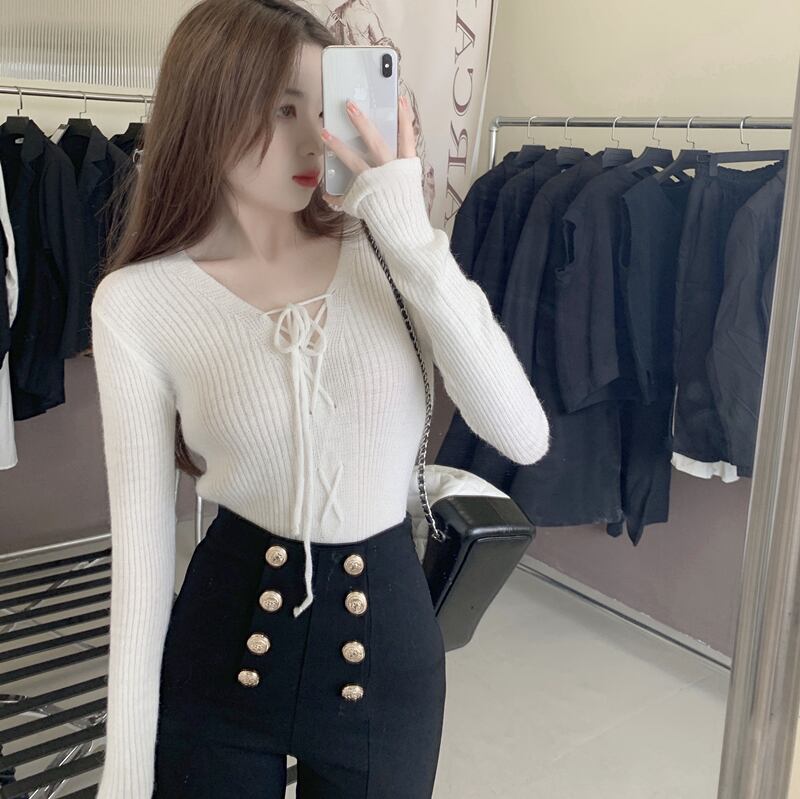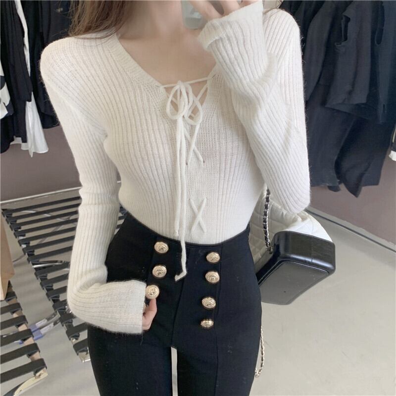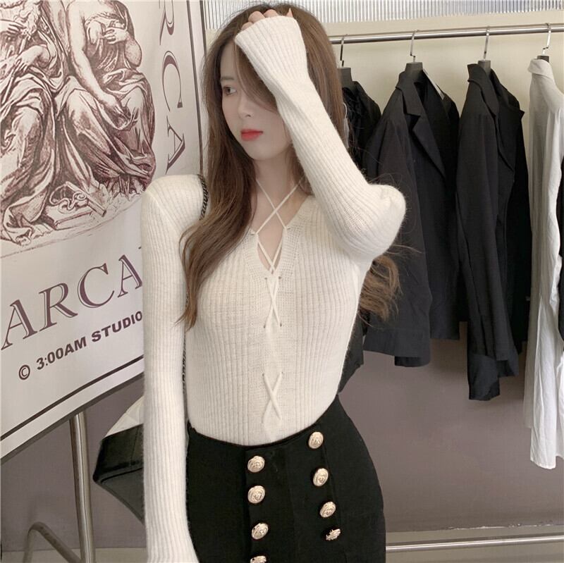 クロスVネックスリムニットセーター レディースオータムウィンタースタイルソリッド カラークロップドトップス 秋物 冬物 ソリッドカラー ドラファッションホール16074296891