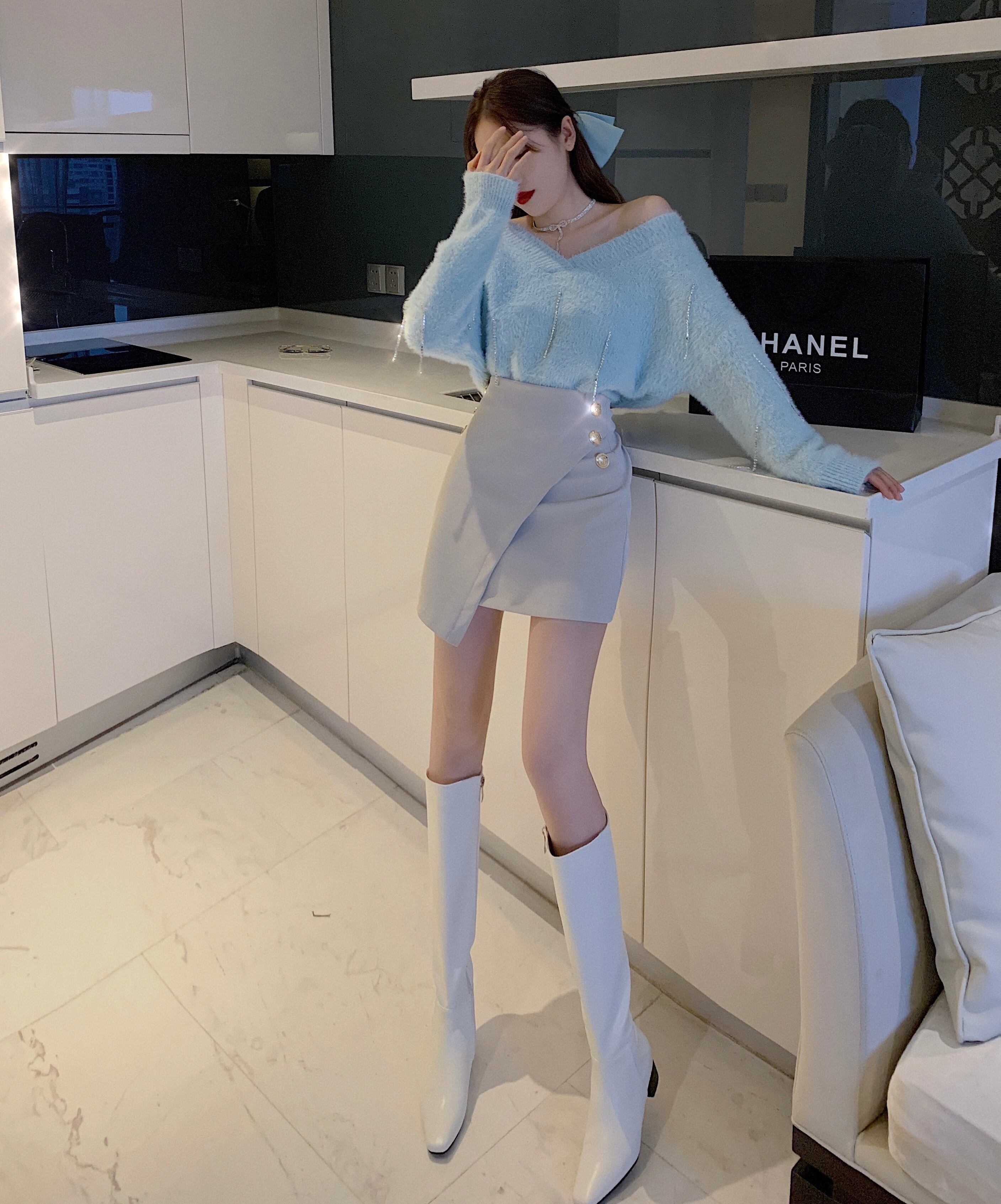 色:青いセーター,白いセーター,アプリコットレザースカート,黒革のスカート