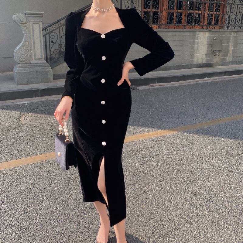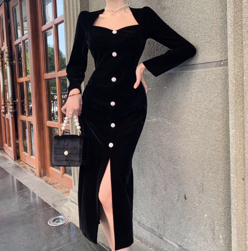 ブラックベルベットVネックドレス レディースオータムウィンターソリッド カラースリムスカート 秋物 冬物 ソリッドカラー ドラファッションホール71459661382