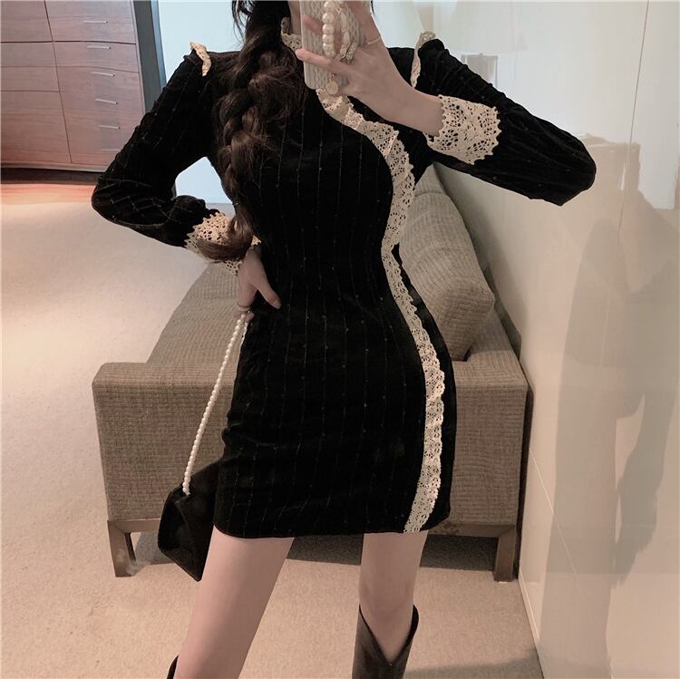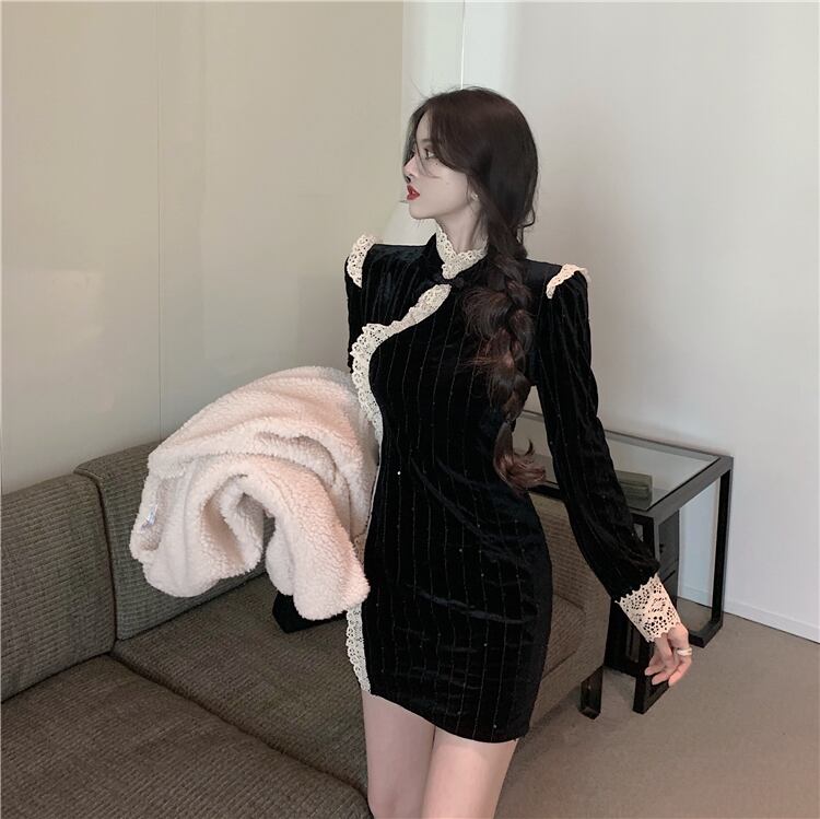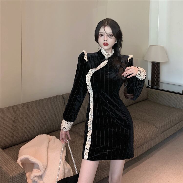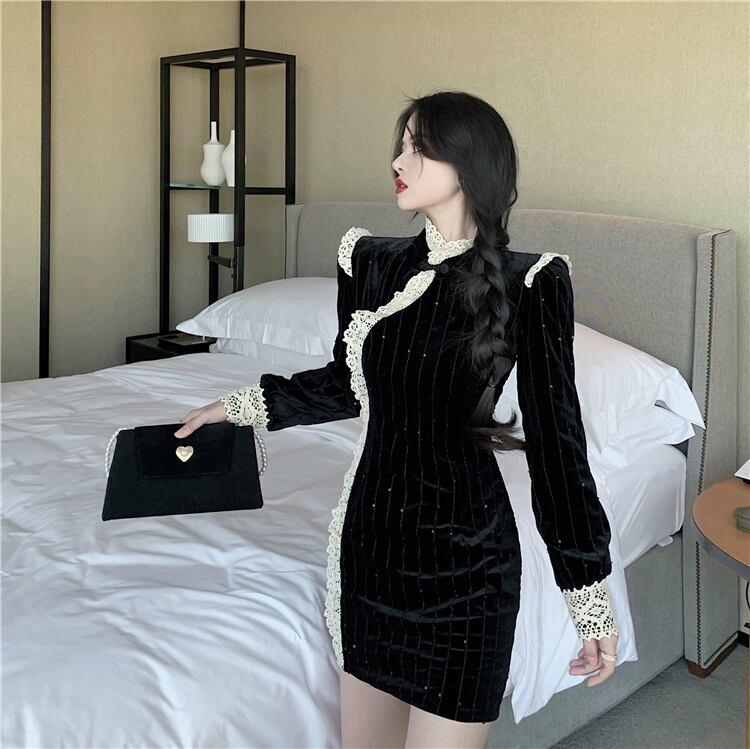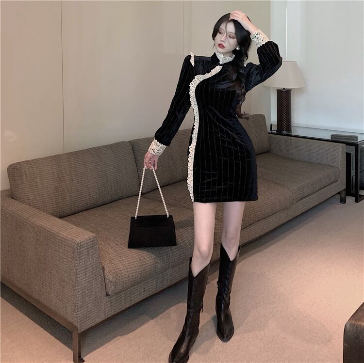 ドレス レディースオータムウィンターベルベットスリムスカート レッド 刺繍 秋物 冬物 ドラファッションホール78987683306