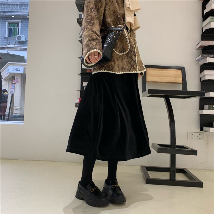 スタンダードストレッチウェストゴールドベルベットスカート レディースオータムウィンターブラックソリッド カラーロング レトロ エラスティック 伸縮 秋物 冬物 ソリッドカラー ドラファッションホール8648138817