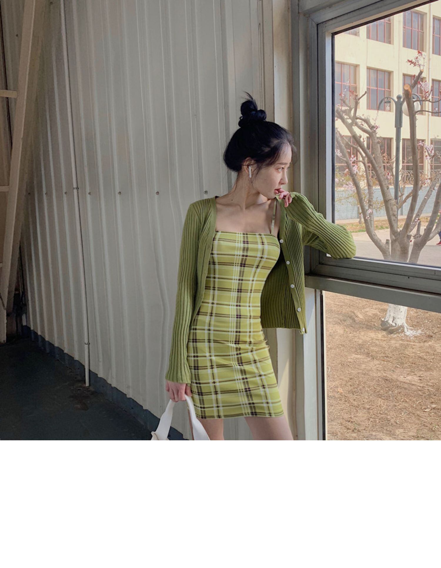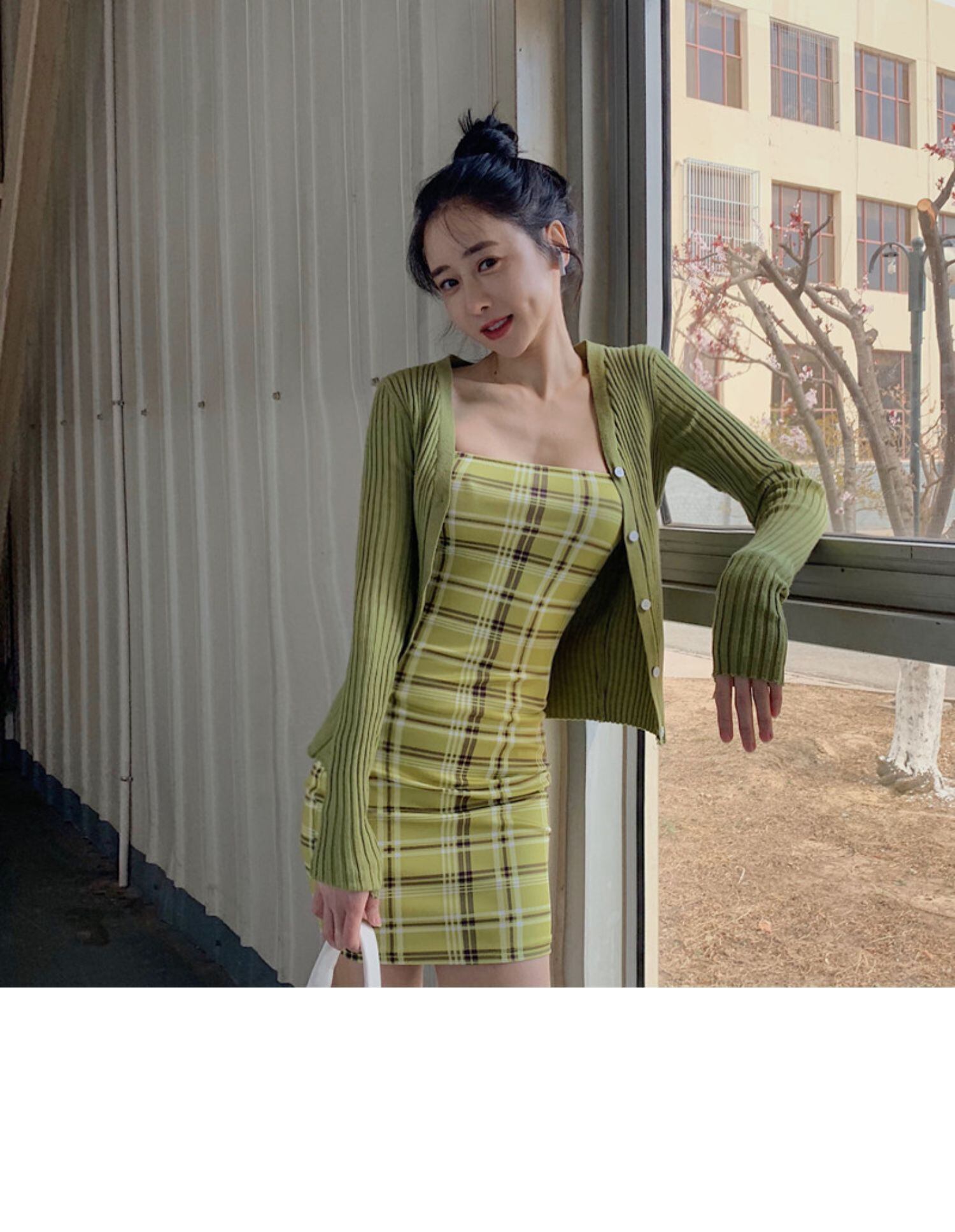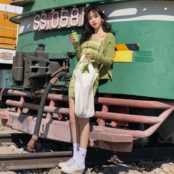 スプリングサマースタンダード格子柄ドレス ショートVネックニットカーディガン レトロ 春物 夏物 ドラファッションホール37104372027