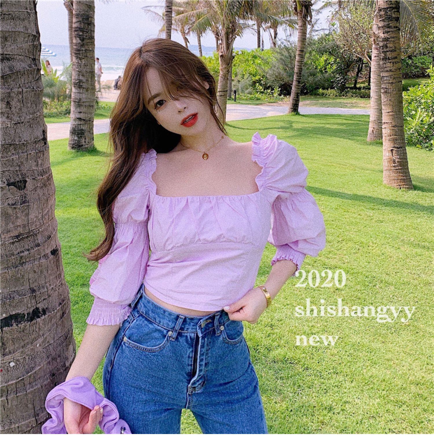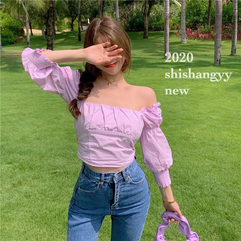 ブラウス スプリングスタイルショートハイウェストカラースタンダードTシャツ ロング レトロ レース 春物 パープル ドラファッションホール23117056768