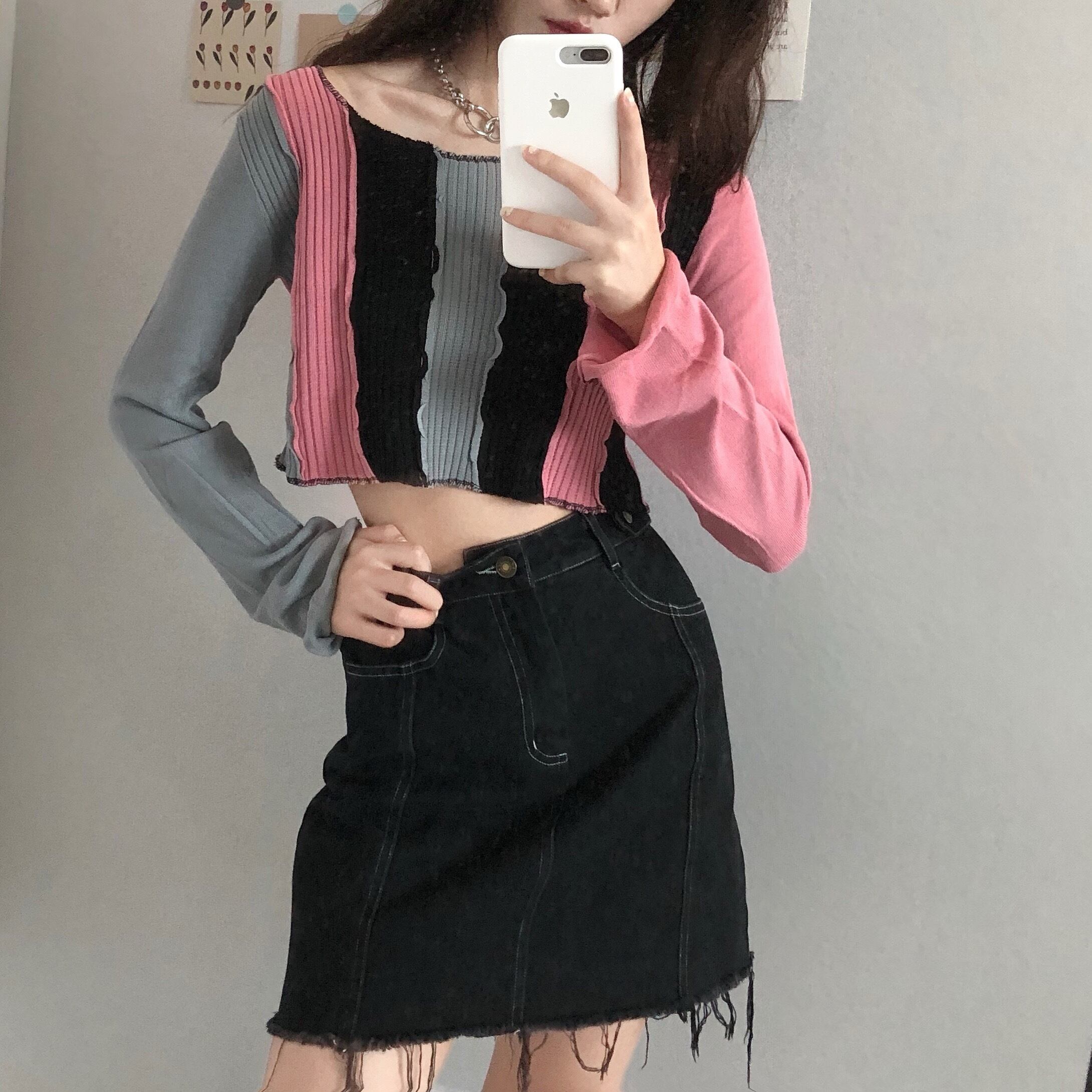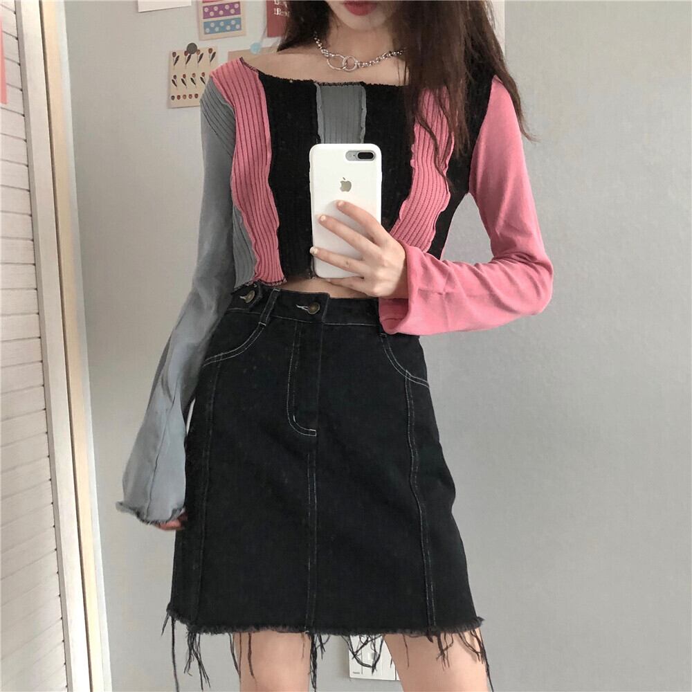 ラウンドネックTシャツ ニットセーター レディーススプリングショートブラウス ロング 春物 Oネック ステッチ ドラファッションホール54748122319