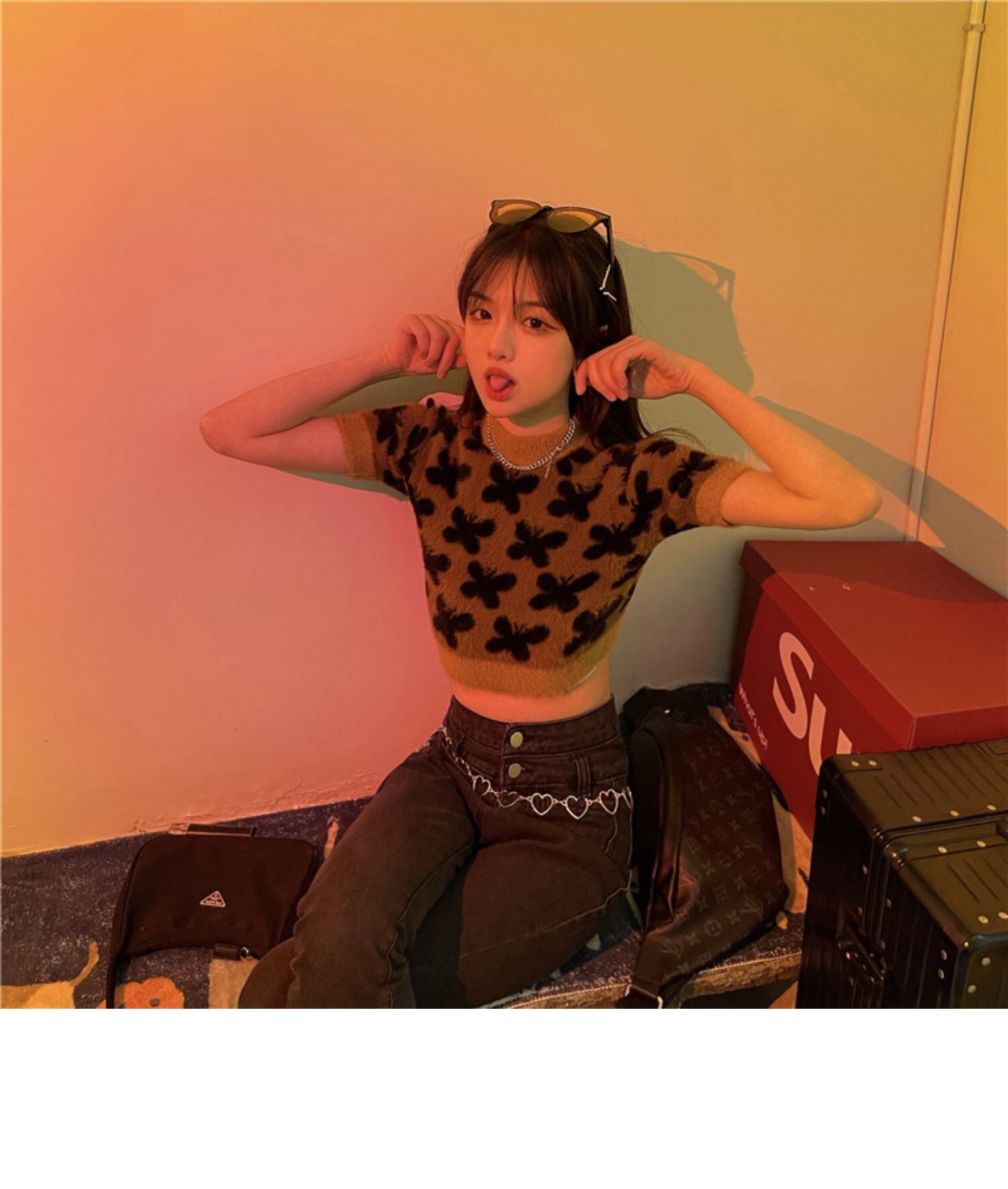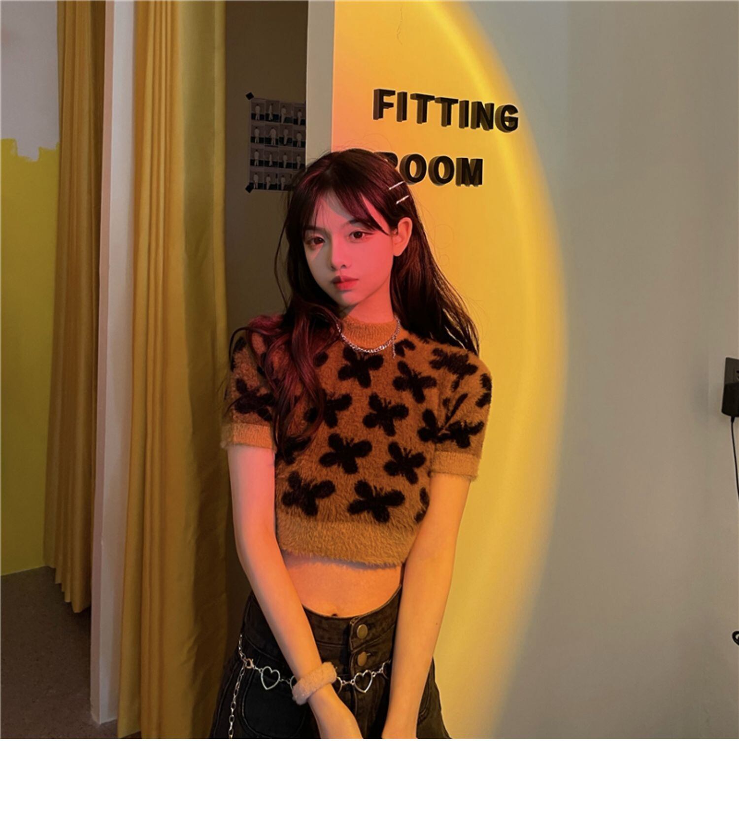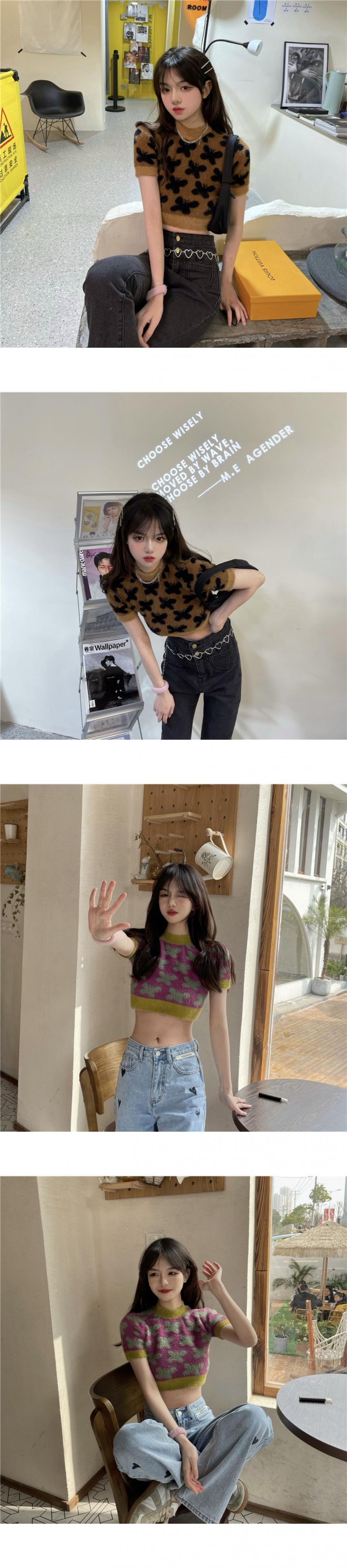 Butterflyデザイン ジャカードカラーショートハイウェストニットTシャツ スプリングスリム 春物 ドラファッションホール88569393454