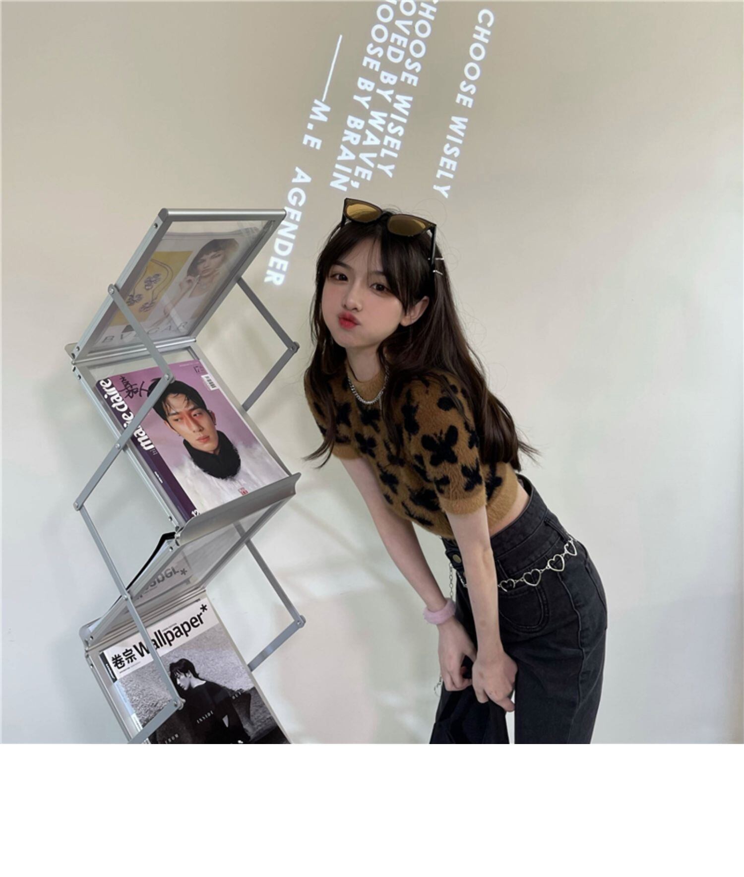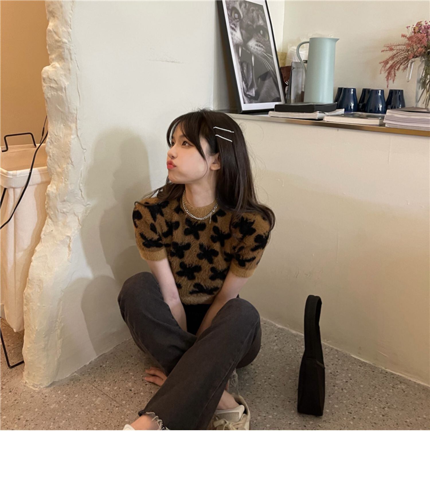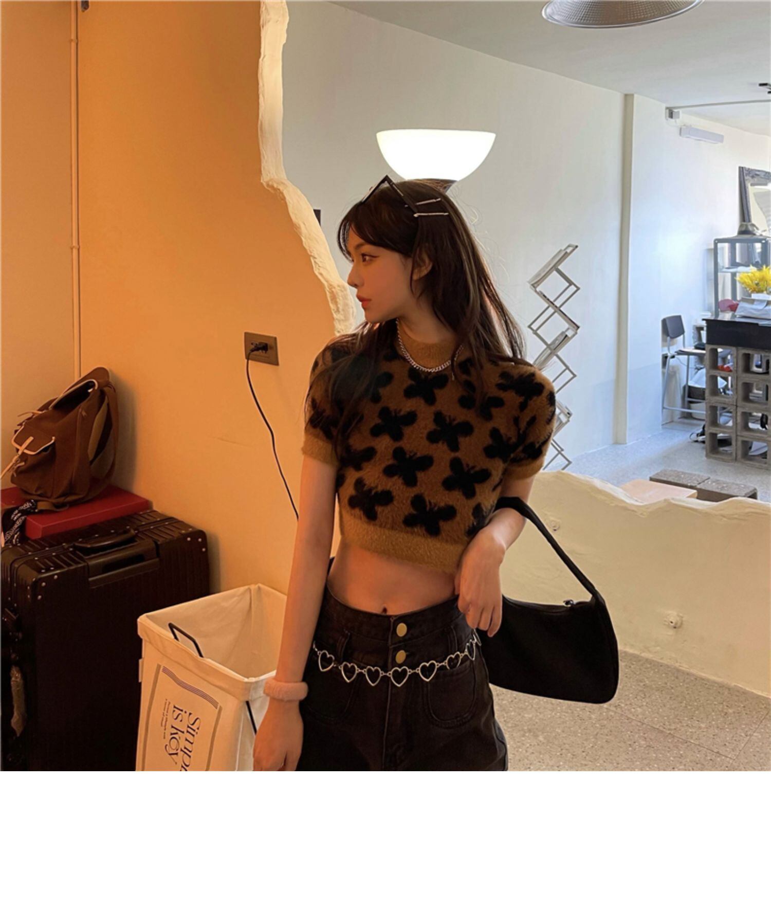 Butterflyデザイン ジャカードカラーショートハイウェストニットTシャツ スプリングスリム 春物 ドラファッションホール88569393454