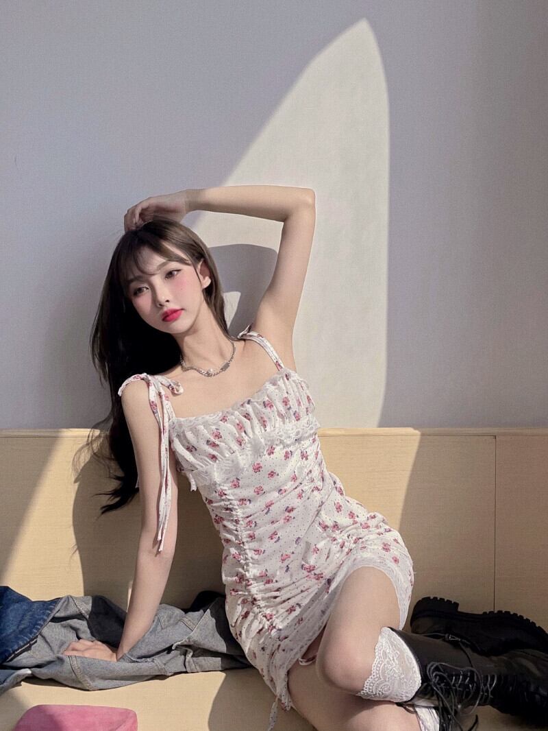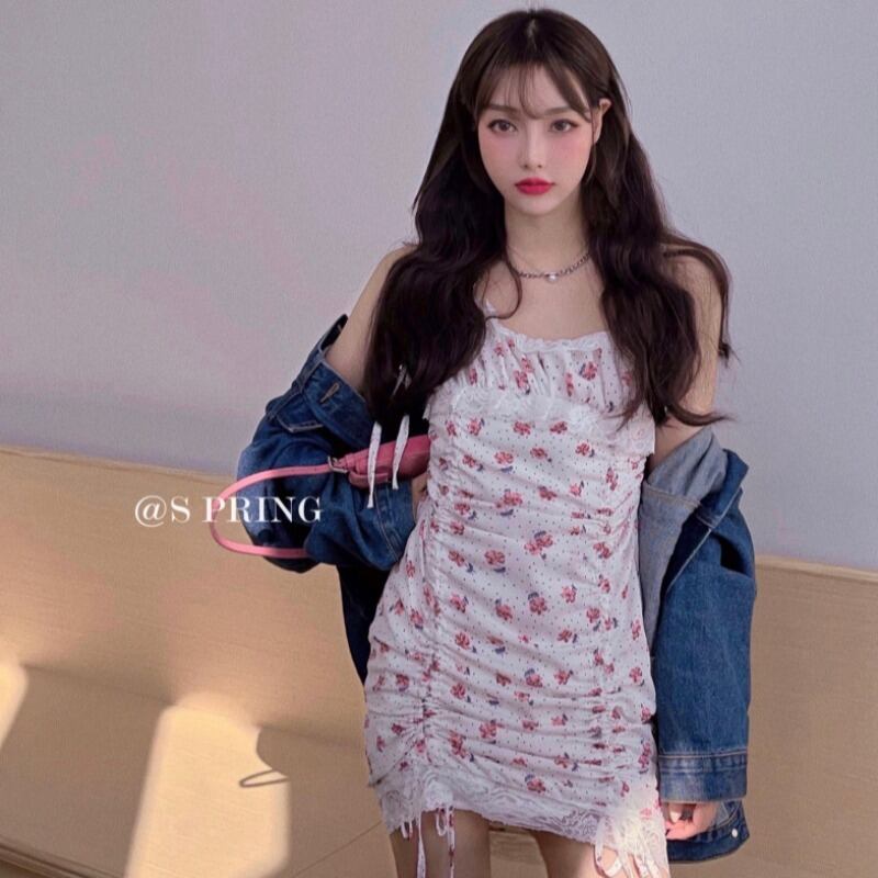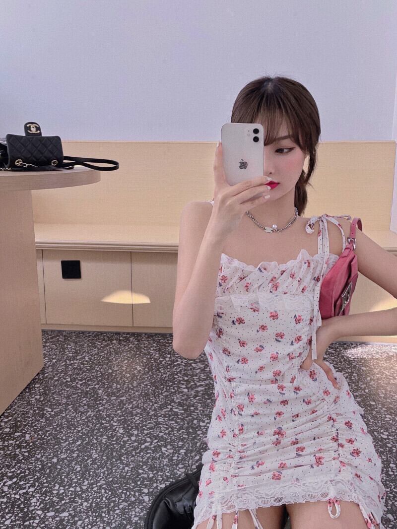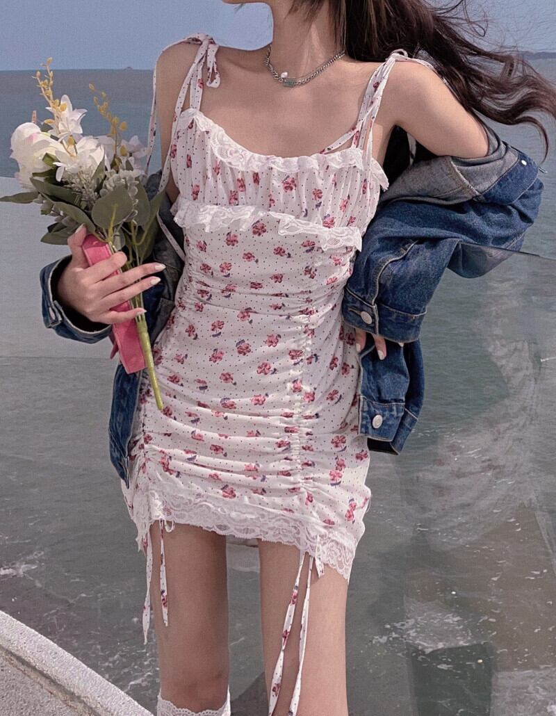 レースフローラルVネックドレス サマースタンダードショートスカート レトロ 夏物 花柄 ドラファッションホール39259446742