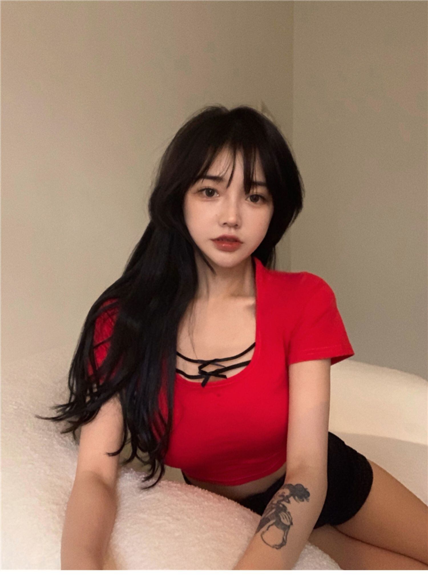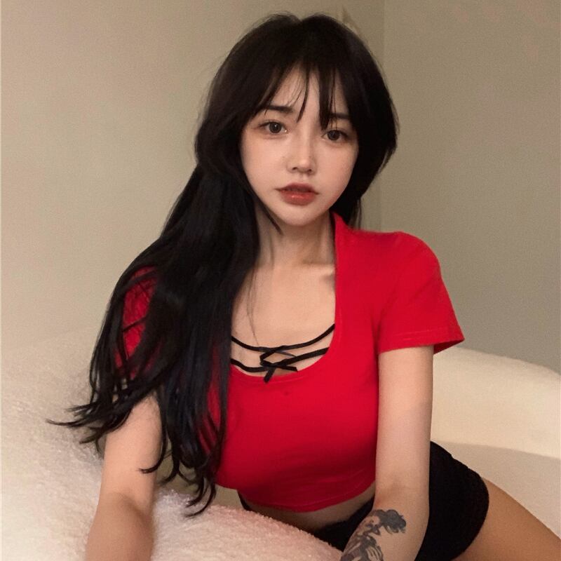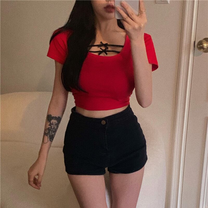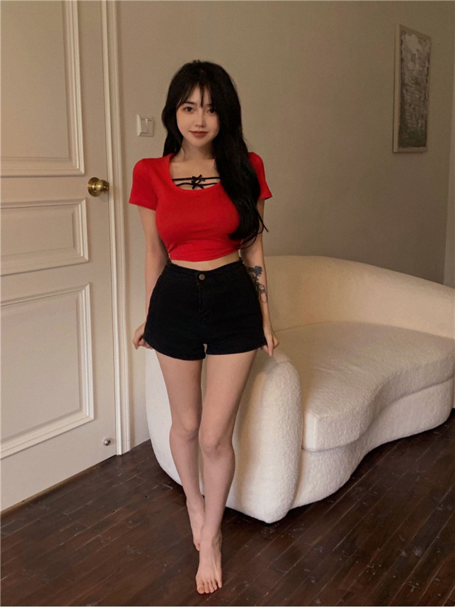 レッドラウンドネック薄手サマーリボンブラックショーツ 夏物 ブルマー Oネック ドラファッションホール7533317773
