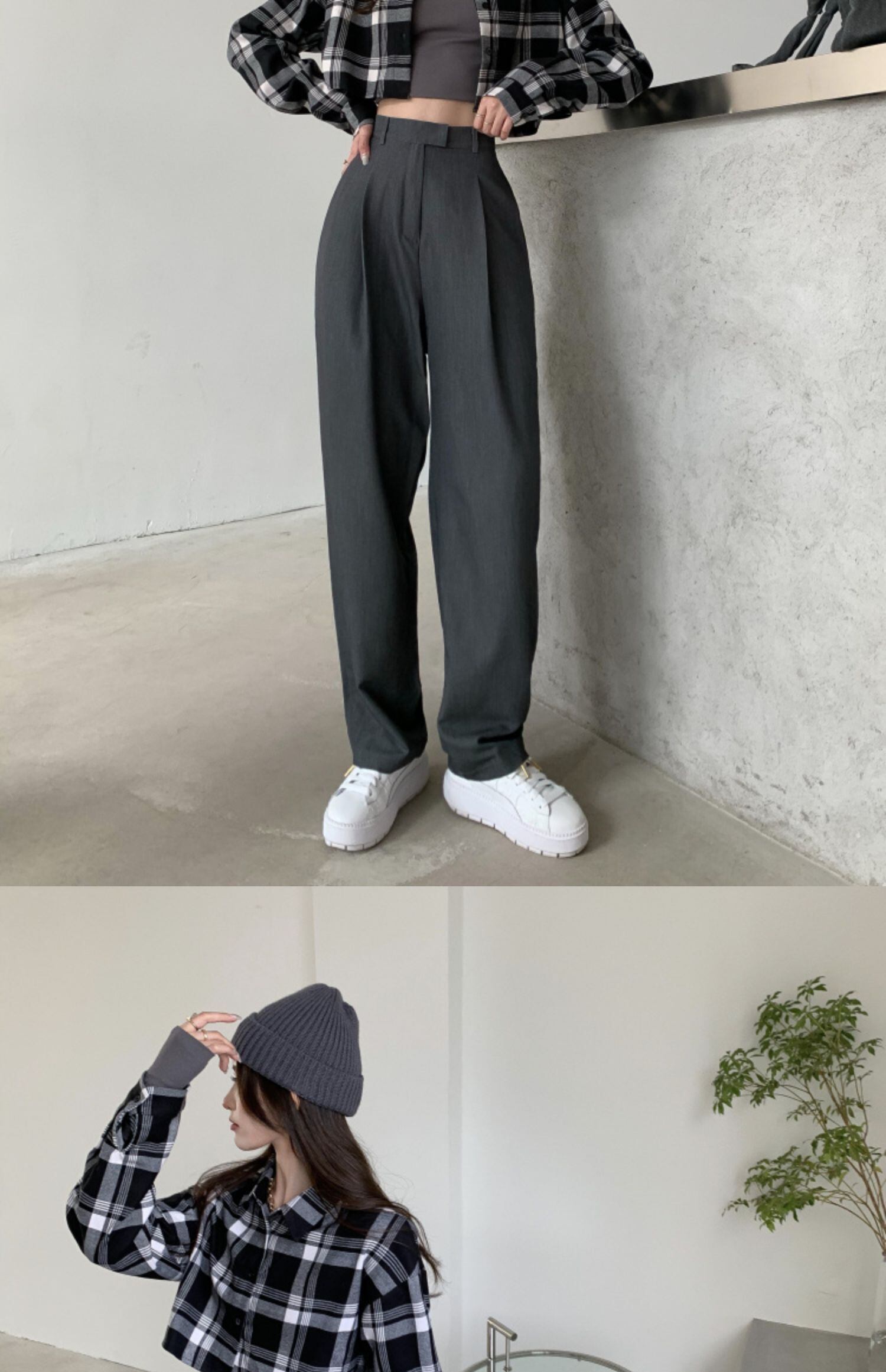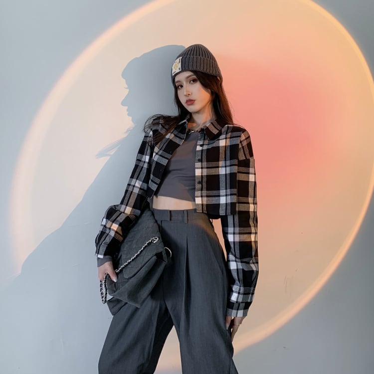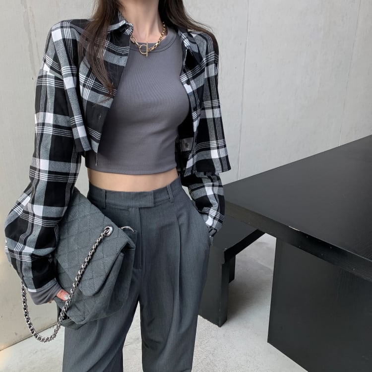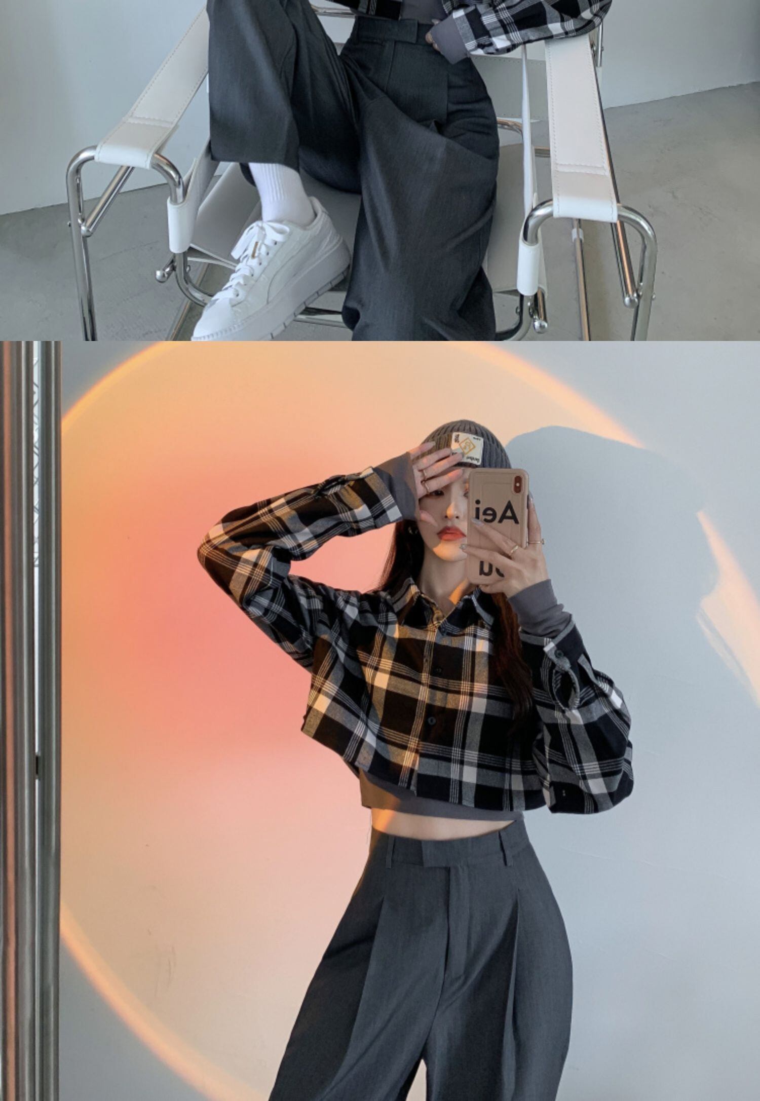 ショートクロップドスプリング格子柄シャツ ハイウェストパンツ コットン 春物 ドラファッションホール5968103010