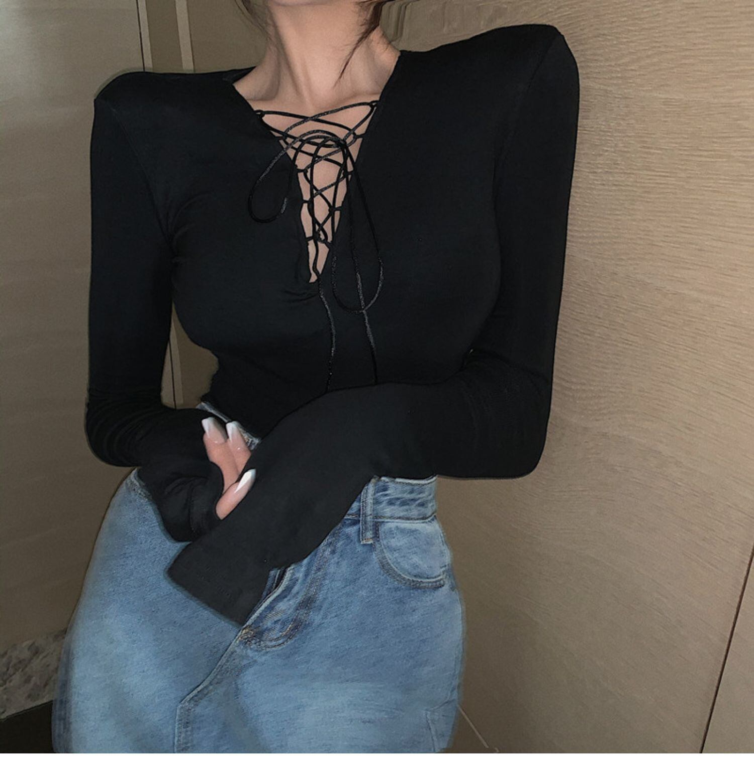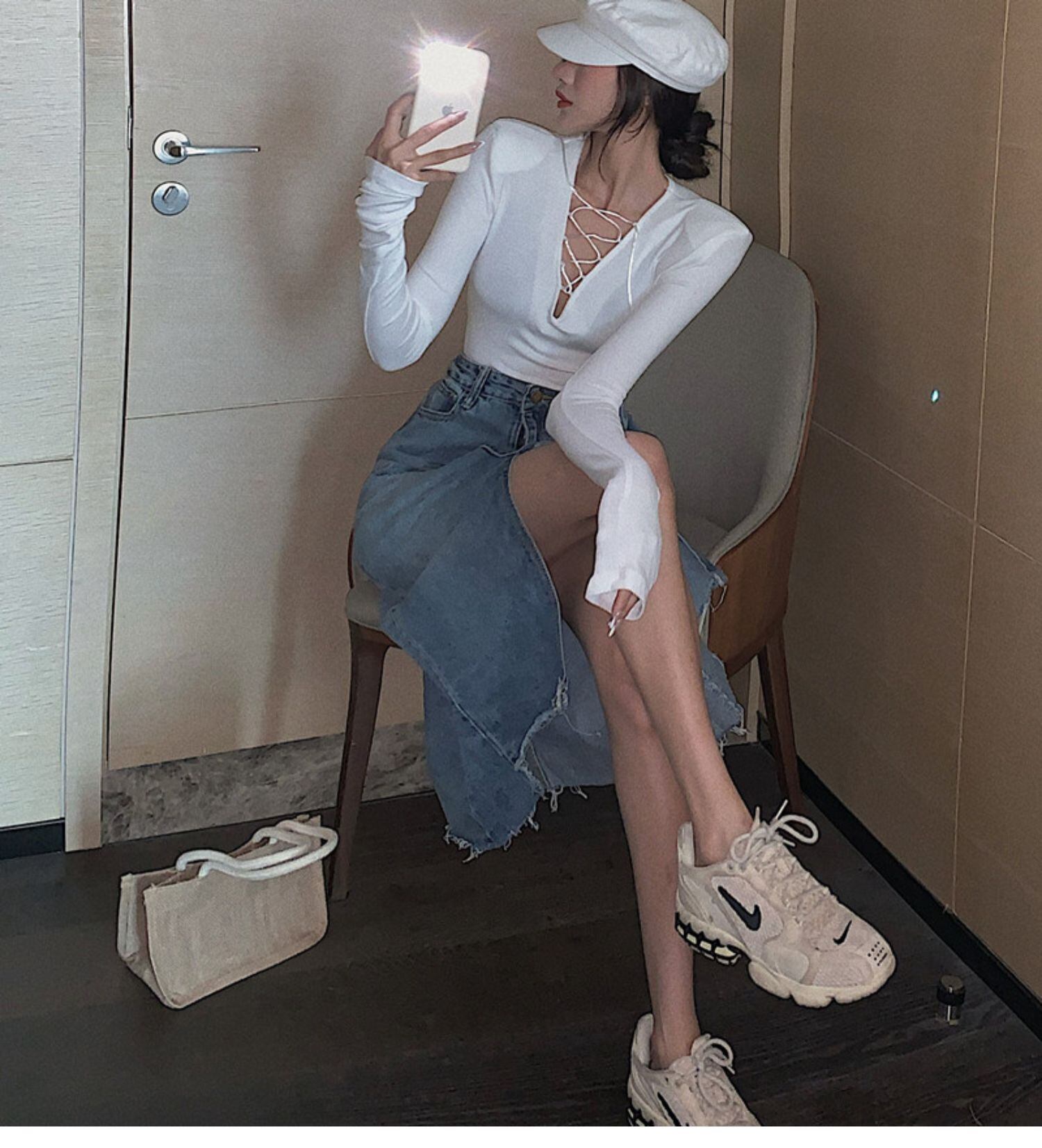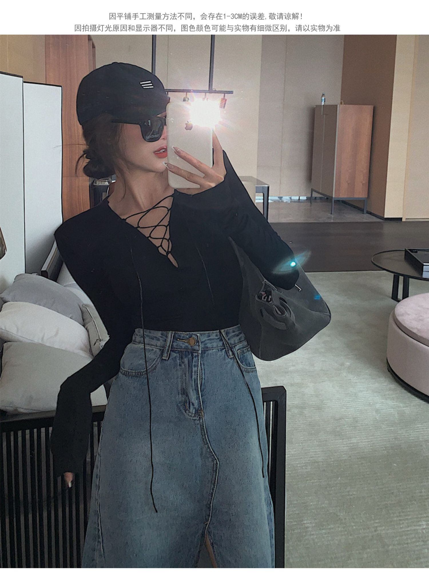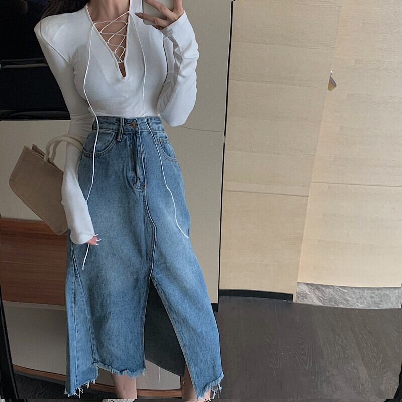 レースTシャツ カーディガンVネックトップス スプリングハイウェストウェストロングスカート 春物 レースアップ ドラファッションホール1205839848