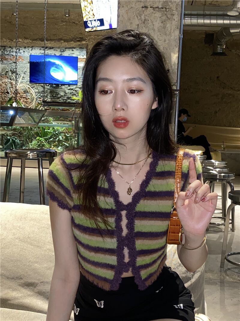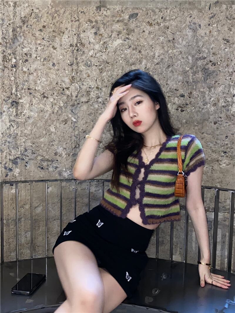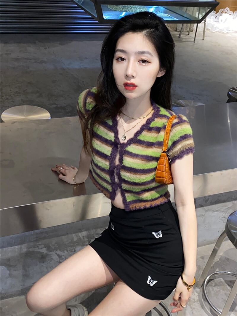 グリーンストライプカーディガンニットトップス レディースサマーハイウェストウェストButterflyデザイン スカート レッド 刺繍 夏物 ドラファッションホール37339949008
