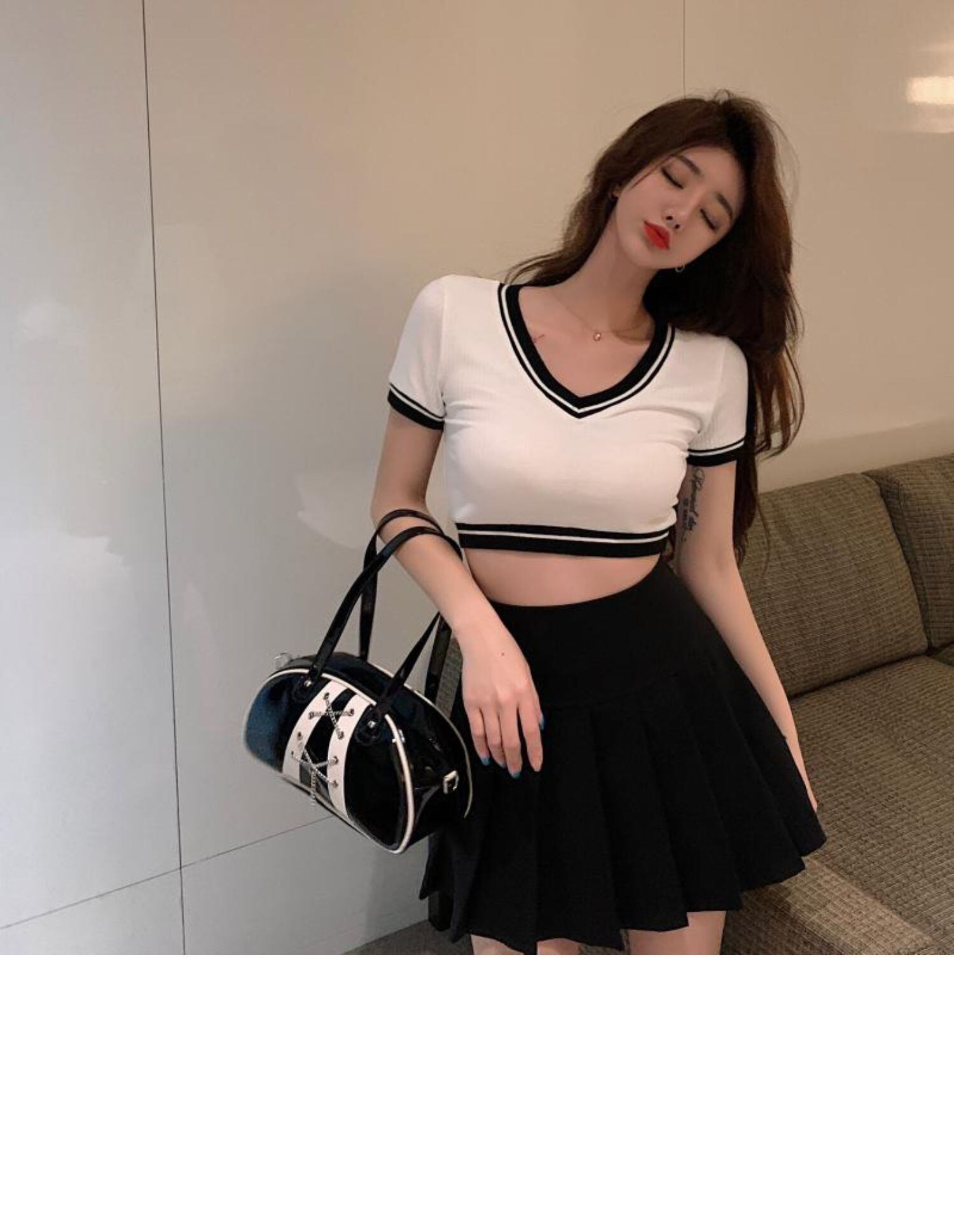 サマースタンダードVネックカラーレッドショートトップス ハイウェストTシャツ レディース レトロ 夏物 ドラファッションホール18468557028