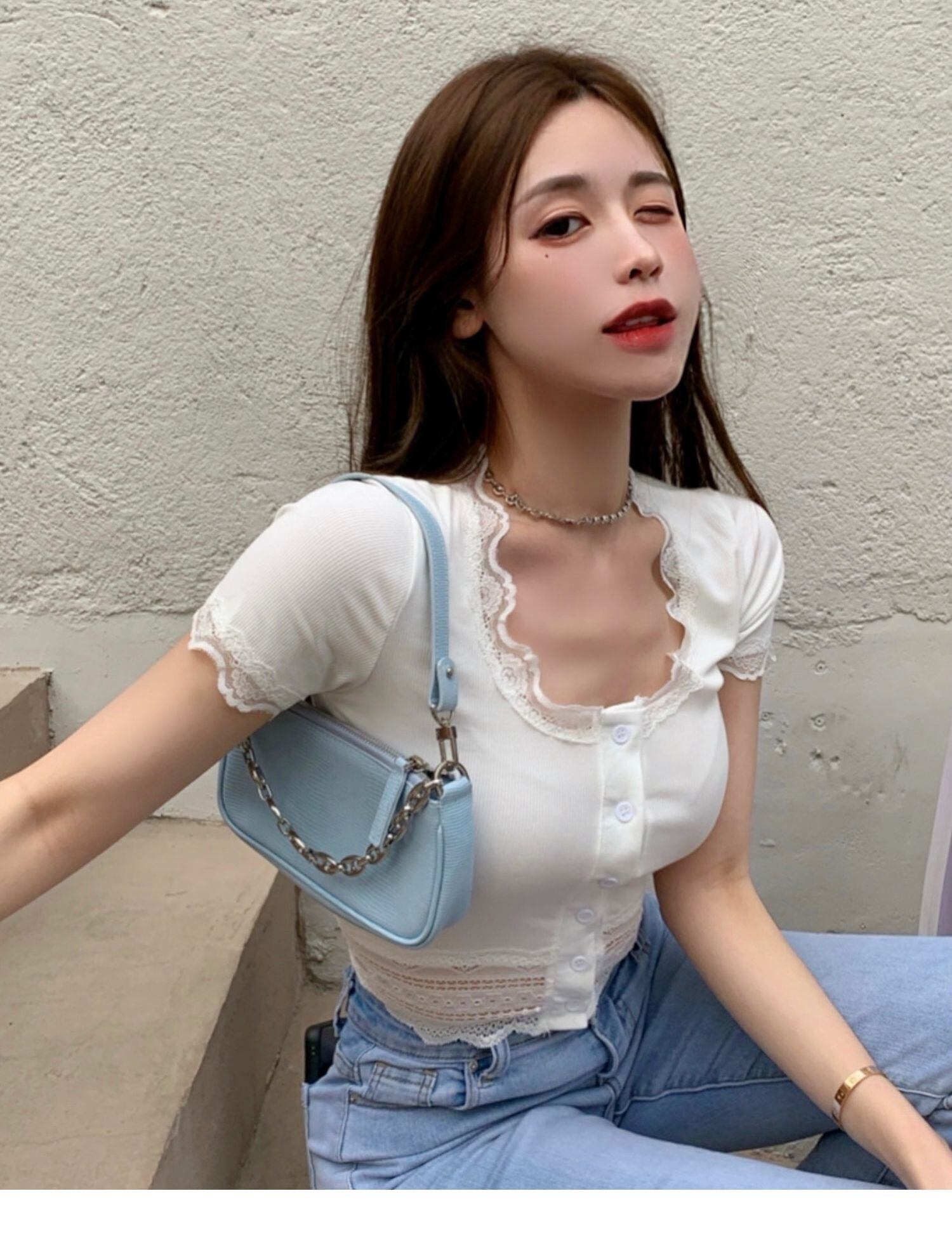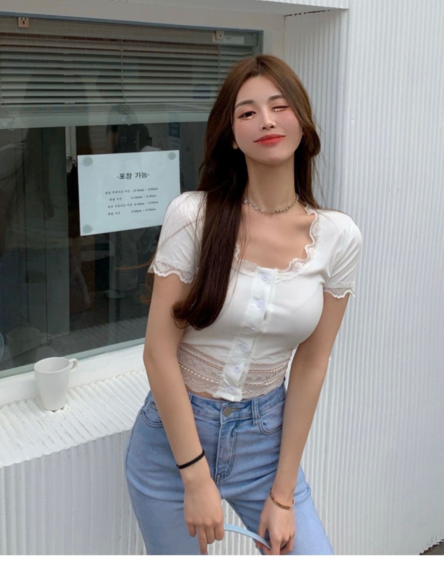 レースショートトップス サマースリム薄手カラーTシャツ 夏物 ピュア スクウェア ステッチ ドラファッションホール77717322044